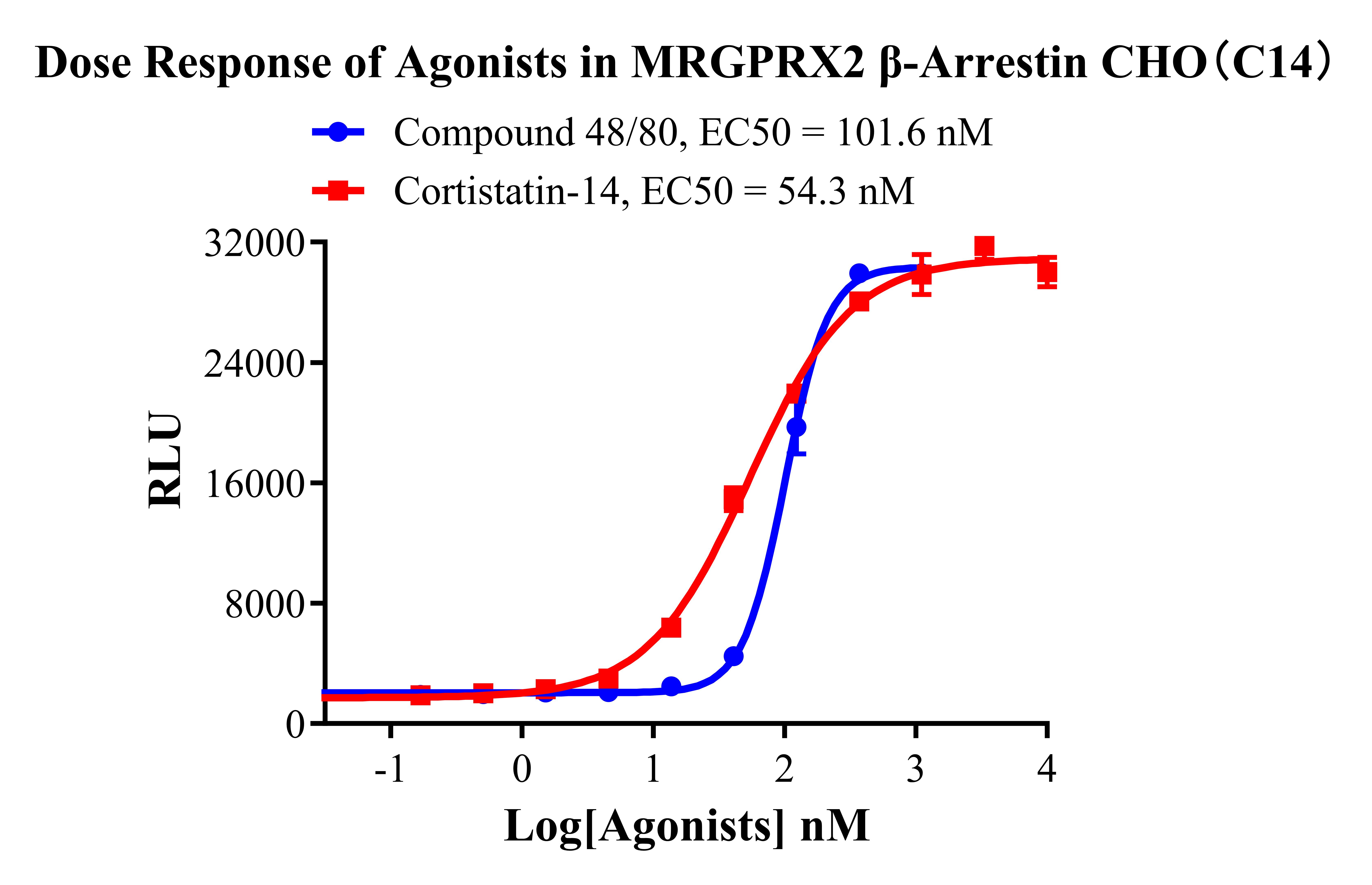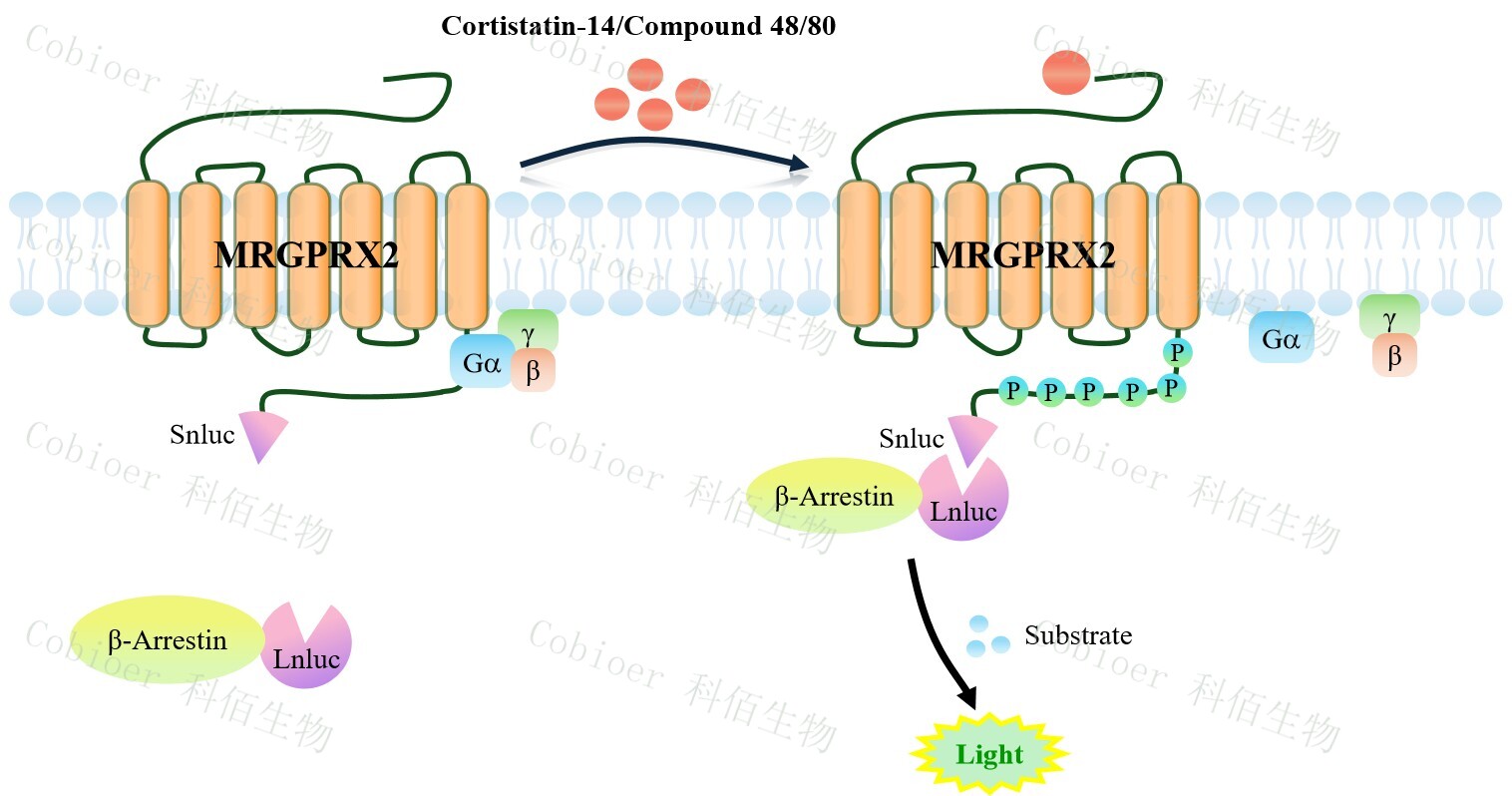MRGPRX2 β-Arrestin CHO 報(bào)告基因藥靶模型很好的模擬了體內(nèi) MRGPRX2/β-Arrestin 的信號(hào)轉(zhuǎn)導(dǎo)過(guò)程,原理見(jiàn)下圖所示。當(dāng)缺乏配體刺激時(shí),β-Arrestin 不與 MRGPRX2 結(jié)合, 融合β-Arrestin 的熒光素酶處于失活構(gòu)象;當(dāng) MRGPRX2 遭遇配體刺激時(shí),融合熒光素酶報(bào) 告基因的β-Arrestin 被招募,使熒光素酶報(bào)告基因處于激活狀態(tài),加入其底物后發(fā)光信號(hào)增 強(qiáng)。![]() Figure 1. MRGPRX2 β-Arrestin CHO 細(xì)胞模型原理圖 |