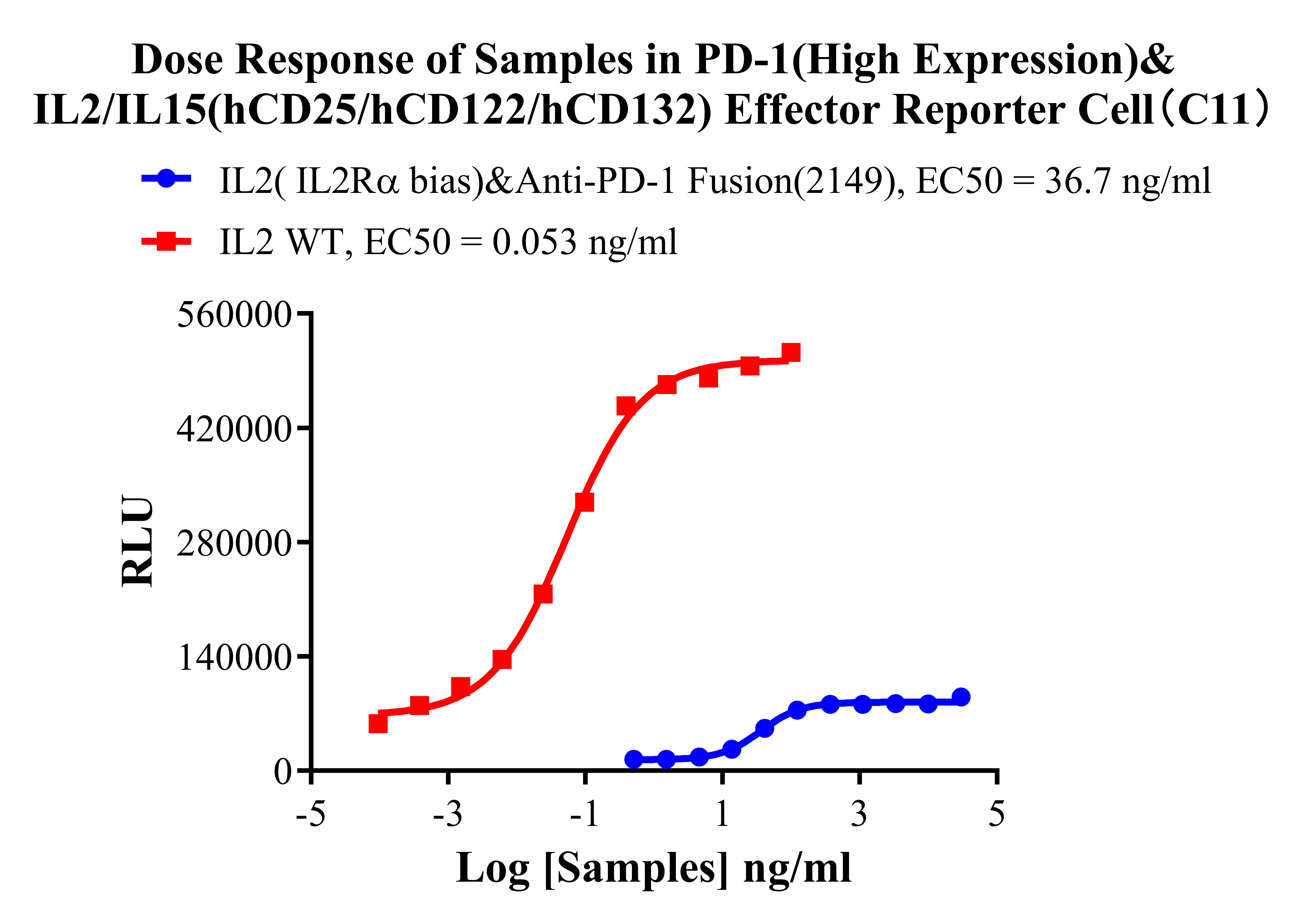 ![]() Figure 2. Recombinant PD-1(High Expression)&IL2/IL15(hCD25/hCD122/hCD132) Effector Reporter Cell stably expressing PD-1、CD25、CD122、CD132. ![]() Figure 3. Recombinant PD-1(High Expression)&IL2/IL15(hCD25/hCD122/hCD132) Effector Reporter Cell and PD-1(Low Expression)&IL2/IL15(hCD25/hCD122/hCD132) Effector Reporter Cellstably expressing PD-1. ![]() Figure 4. Dose Response of IL2 (IL2Rα bias)&Anti-PD-1 Fusion in PD-1(High Expression) &IL2/IL15(hCD25/hCD122/hCD132) Effector Reporter Cell(C11)vs IL2/IL15(hCD25/hCD122/hCD132) Effector Reporter Cell(C26). ![]() Figure 5. Dose Response of IL2 (IL2Rabias)&Anti-PD-1 Fusion in PD-1&IL2/IL15(hCD25/hCD122/hCD132) Effector Reporter Cell vs IL2/IL15(hCD25/hCD122/hCD132) Effector Reporter Cell(C26). ![]() Figure 6. Dose Response of Samples in PD-1(High Expression) &IL2/IL15(hCD25/hCD122/hCD132) Effector Reporter Cell(C11). |