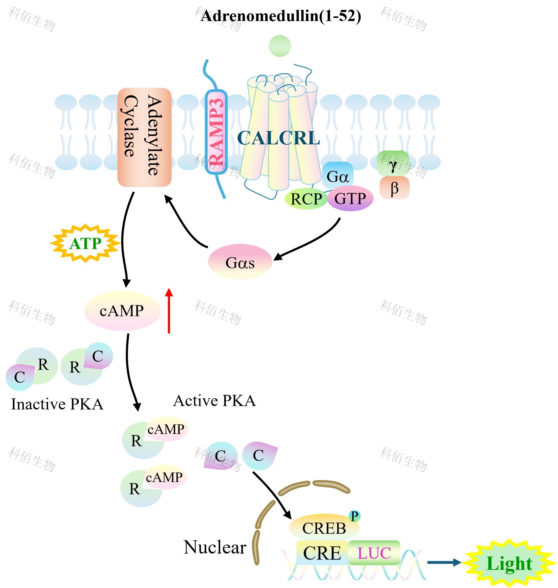 CALCRL&RAMP3 CRE-Luc HEK293 報告基因藥靶模型很好的模擬了體內(nèi) Adrenomedullin 的信號轉(zhuǎn)導過程,原理見下圖所示。