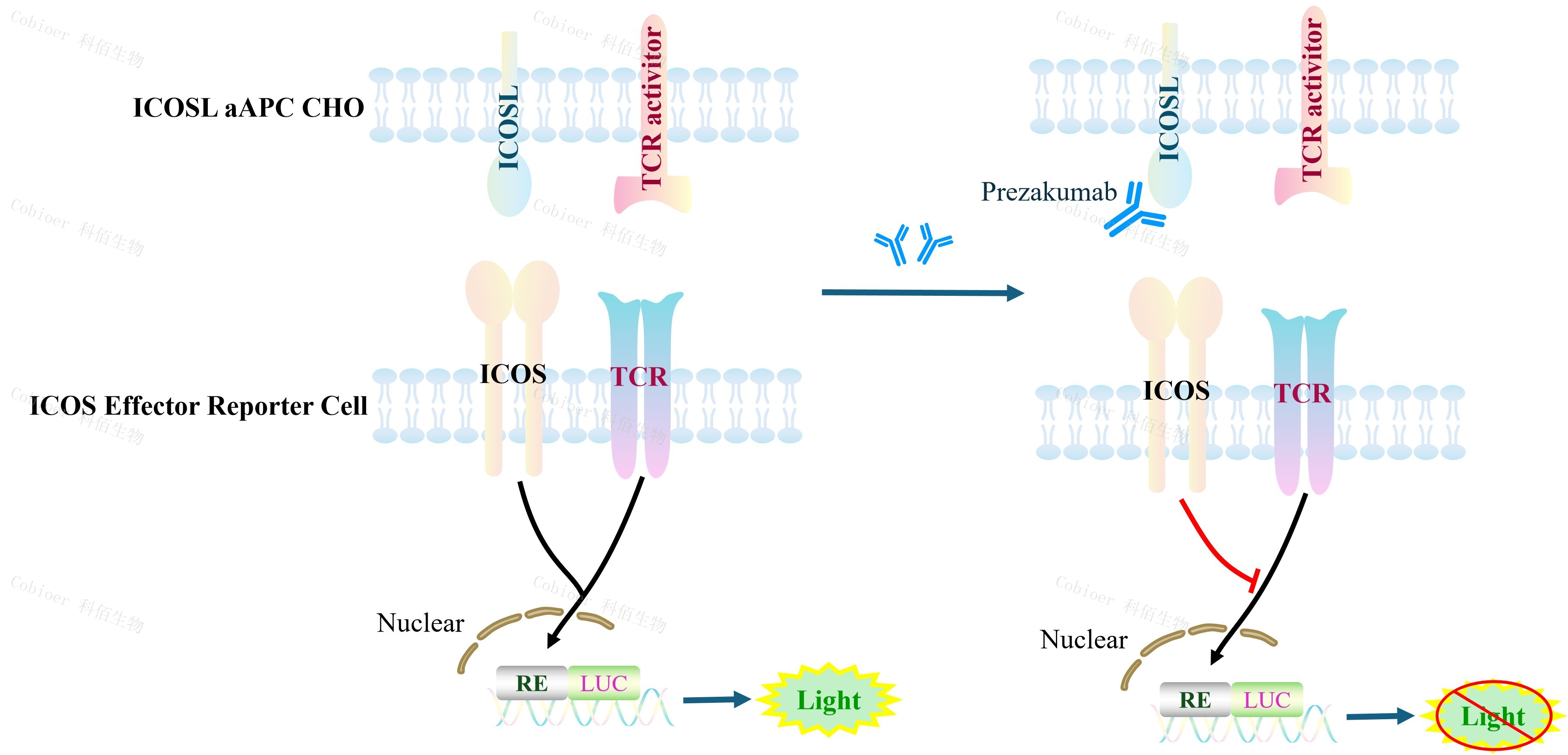ICOSL aAPC CHO 作為 ICOS Effector Reporter Cell 的靶細(xì)胞,很好的模擬了體內(nèi) ICOS 的信號(hào)轉(zhuǎn)導(dǎo)過(guò)程,原理見(jiàn)下圖所示。![]() Figure 1. ICOSL aAPC CHO 細(xì)胞模型原理圖 |