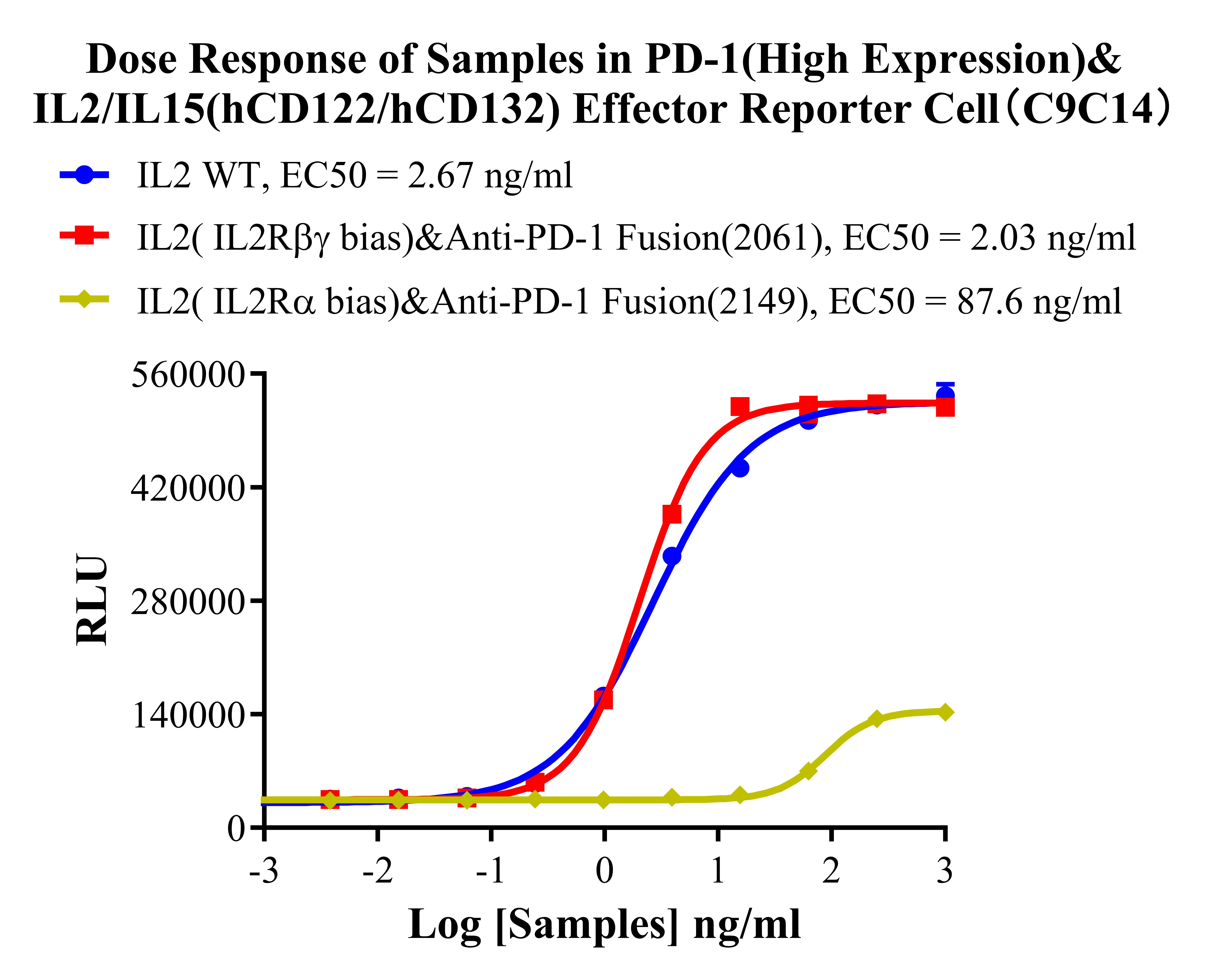 ![]() Figure 2. Recombinant PD-1&IL2/IL15(hCD122/hCD132) Effector Reporter Cell stably expressing PD-1&CD122&CD132&CD25. ![]() Figure 3. Recombinant PD-1(High Expression)&IL2/IL15(hCD122/hCD132) Effector Reporter Cell and PD-1(Medium Expression)&IL2/IL15(hCD122/hCD132) Effector Reporter Cell and PD-1(Low Expression)&IL2/IL15(hCD122/hCD132) Effector Reporter Cell stably expressing PD-1. ![]() Figure 4. Dose Response of IL2 (IL2Rβγ bias)&Anti-PD-1 Fusion in PD-1(High Expression) &IL2/IL15(hCD122/hCD132) Effector Reporter Cell(C9C14) vs IL2/IL15(hCD122/hCD132) Effector Reporter Cell(C9). ![]() Figure 5. Dose Response of IL2 (lL2Rβγ bias)&Anti-PD-1 Fusion in PD-1&IL2/IL15(hCD122/hCD132) Effector Reporter Cell vs IL2/IL15(hCD122/hCD132) Effector Reporter Cell(C9). ![]() Figure 6. Dose Response of Samples in PD-1(High Expression)&IL2/IL15(hCD122/hCD132) Effector Reporter Cell(C9C14). |