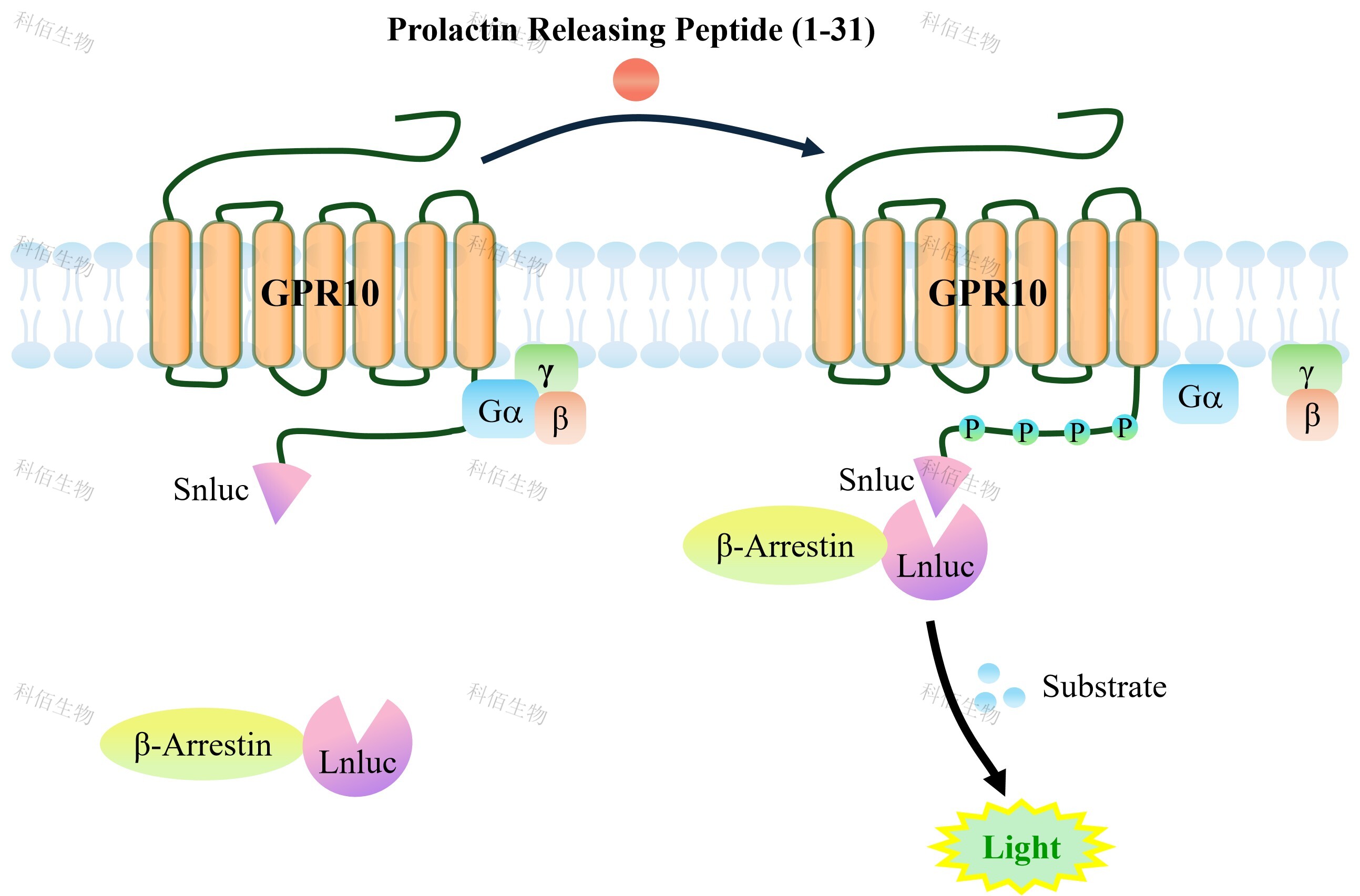 GPR10 β-Arrestin CHO 報(bào)告基因藥靶模型很好的模擬了體內(nèi) GPR10/β-Arrestin 的信號(hào)轉(zhuǎn)導(dǎo)過(guò)程,原理見(jiàn)下圖所示。當(dāng)缺乏配體刺激時(shí),β-Arrestin 不與 GPR10 結(jié)合,融合β- Arrestin 的熒光素酶處于失活構(gòu)象,當(dāng) GPR10 遭遇配體刺激時(shí),融合熒光素酶報(bào)告基因的 β-Arrestin 被招募,使熒光素酶報(bào)告基因處于激活狀態(tài),加入其底物后發(fā)光信號(hào)增強(qiáng)。![]() Figure 1. GPR10 β-Arrestin CHO 細(xì)胞模型原理圖 |