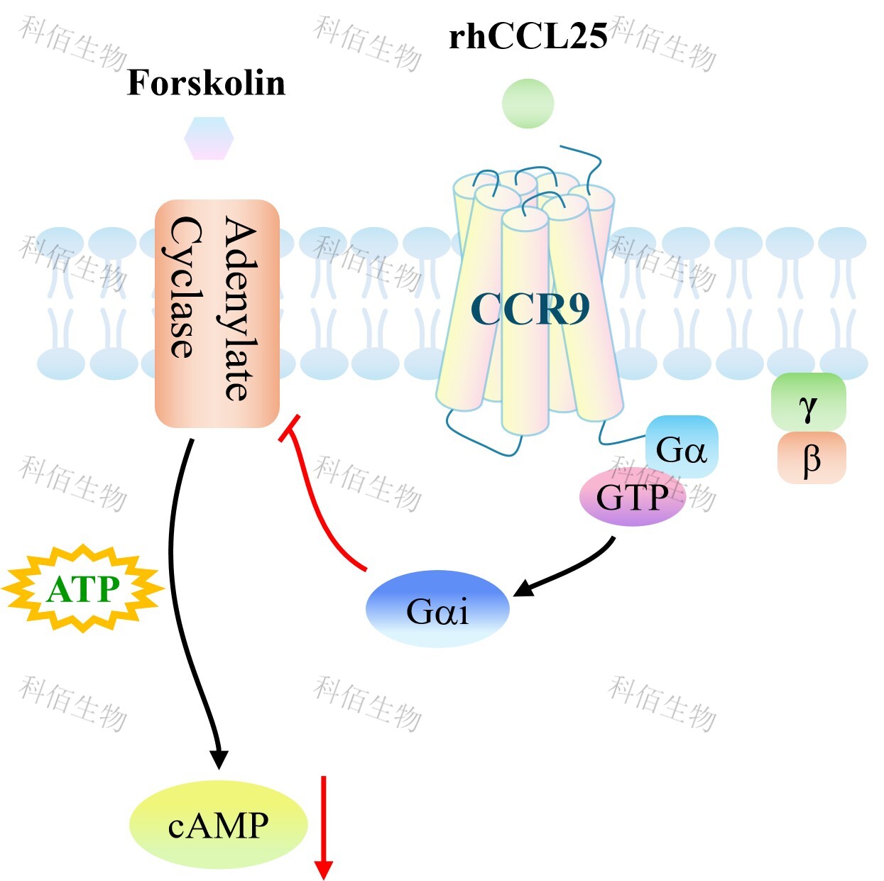 cAMP 在 G 蛋白偶聯(lián)受體(GPCR)信號(hào)轉(zhuǎn)導(dǎo)中是一種關(guān)鍵的第二信使。當(dāng)配體結(jié)合到 GPCR,構(gòu)象發(fā)生變化,激活受體接著激活 G 蛋白,Gi 的激活導(dǎo)致腺苷酸環(huán)化酶調(diào)控 cAMP 的下調(diào)。CCR9 藥靶模型很好的模擬了體內(nèi) CCR9 的信號(hào)轉(zhuǎn)導(dǎo)過程,原理見下圖所示。![]() Figure 1. CCR9 CHO 細(xì)胞模型原理圖 |