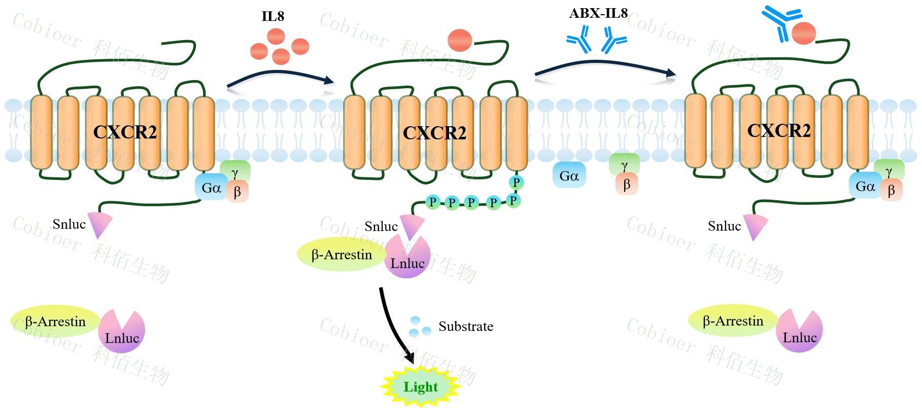 CXCR2 β-Arrestin CHO 報(bào)告基因藥靶模型很好的模擬了體內(nèi) CXCR2/β-Arrestin 的信號(hào)轉(zhuǎn)導(dǎo)過(guò)程,原理見(jiàn)下圖當(dāng)缺乏配體刺激時(shí),β-Arrestin 不與 CXCR2 結(jié)合,融合β- Arrestin 的熒光素酶處于失活構(gòu)象,當(dāng) CXCR2 遭遇配體刺激時(shí),融合熒光素酶報(bào)告基因的 β-Arrestin 被招募,使熒光素酶報(bào)告基因處于激活狀態(tài),加入其底物后發(fā)光信號(hào)增強(qiáng)。![]() Figure 1. CXCR2 β-Arrestin CHO 細(xì)胞模型原理圖 |