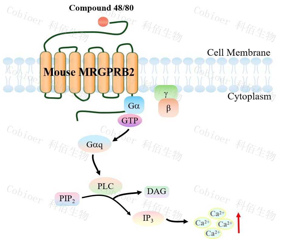 Mouse MRGPRB2 Gα15 HEK293 細(xì)胞,在 Gα15 HEK293 細(xì)胞上,穩(wěn)定表達(dá)鼠的 MRGPRB2。Mouse MRGPRB2 Gα15 HEK293 細(xì)胞藥靶模型很好的模擬了體內(nèi) MRGPRB2&Gα15 的信號(hào)轉(zhuǎn)導(dǎo)過(guò)程,原理見(jiàn)下圖所示。