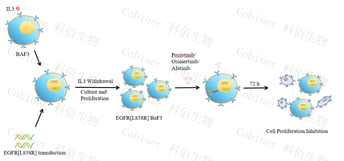 BaF3(小鼠原 B 細(xì)胞)的生長和增殖需要 IL-3 的維持。通過引入各種表達(dá)激酶的基因, 能作為 BaF3 的驅(qū)動基因,讓 BaF3 不再依賴 IL-3 而增殖,進(jìn)而激酶基因成為 BaF3 增殖依 賴的驅(qū)動基因,用于評估小分子藥物對激酶的靶向抑制作用,原理及流程見下圖所示。