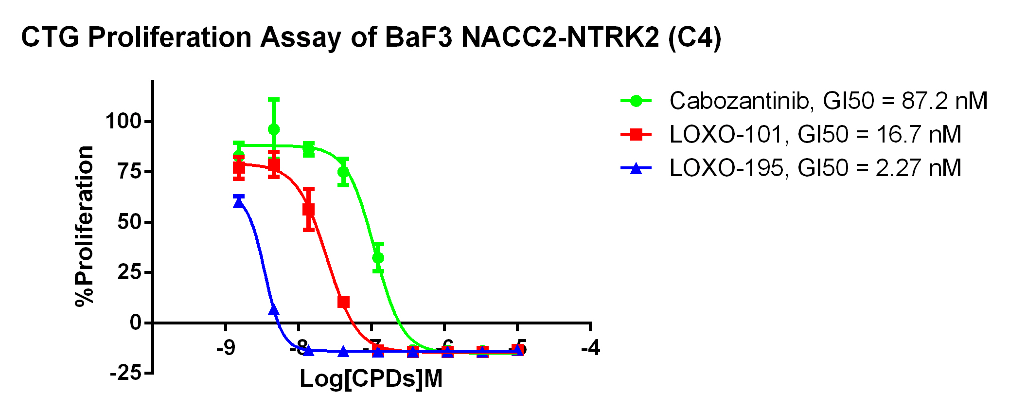 Figure . Anti-proliferation assay of three reference compounds on the NACC2-NTRK2/BaF3 Stable Cell Line. |