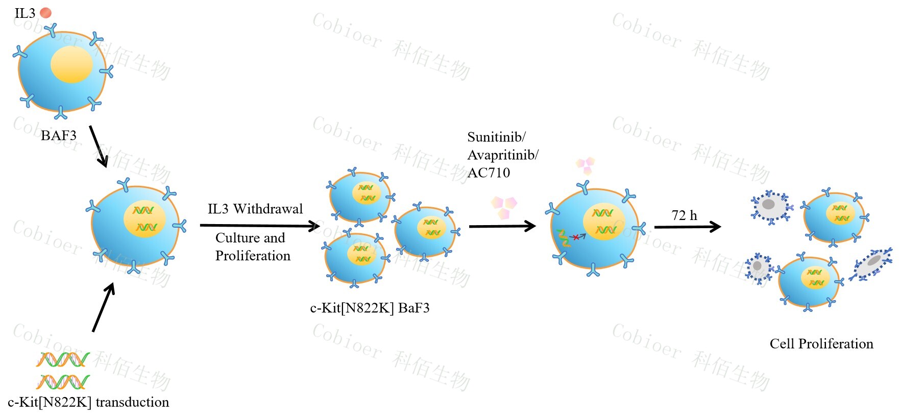 | c-Kit[N822K] BaF3 藥靶細(xì)胞,通過(guò)轉(zhuǎn)導(dǎo)突變狀態(tài)的 c-Kit[N822K] 基因 到 BaF3 細(xì)胞系中,穩(wěn)定表達(dá)人突變形態(tài)下的 c-Kit[N822K] 基因。 BaF3(小鼠原 B 細(xì)胞)的生長(zhǎng)和增殖需要 IL-3 的維持。 通過(guò)引入各種表達(dá)激酶的基因, 能作為 BaF3 的驅(qū)動(dòng)基因,讓 BaF3 不再依賴(lài) IL-3 而增殖,進(jìn)而激酶基因成為 BaF3 增殖依 賴(lài)的驅(qū)動(dòng)基因,用于評(píng)估小分子藥物對(duì)激酶的靶向抑制作用,原理及流程見(jiàn)下圖所示。 ![]() Figure 1. c-Kit[N822K] BaF3 細(xì)胞的構(gòu)建原理圖 |