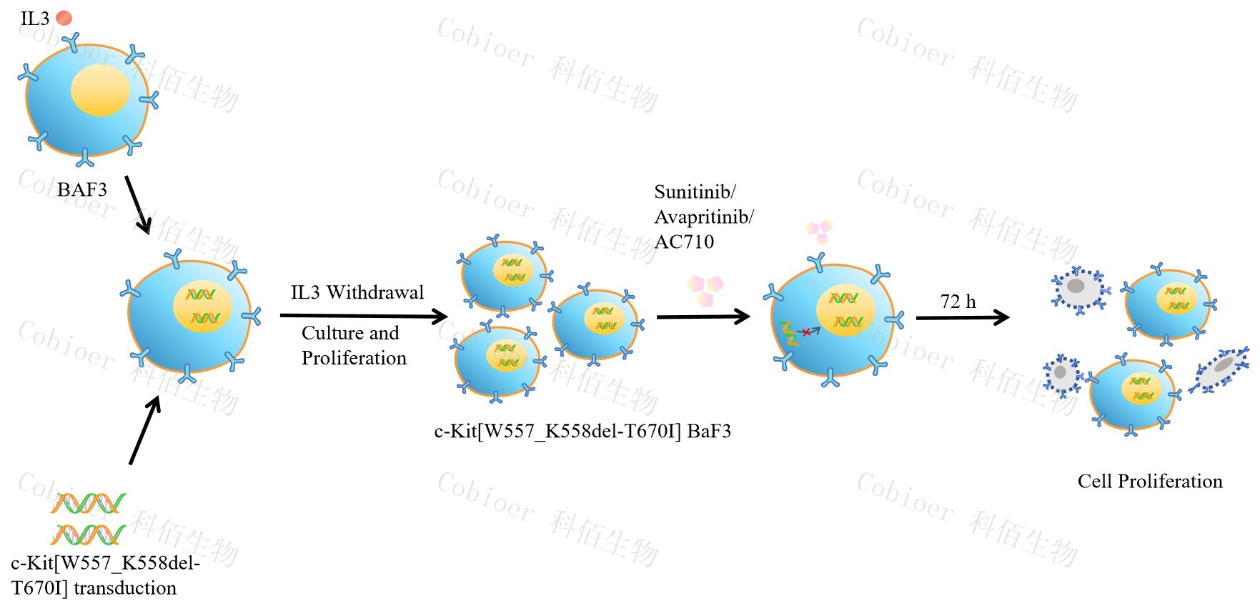 | c-Kit[W557_K558del-T670I] BaF3 藥靶細(xì)胞,通過(guò)轉(zhuǎn)導(dǎo)突變狀態(tài)的 c- Kit[W557_K558del-T670I] 基 因 到 BaF3 細(xì) 胞 系 中 , 穩(wěn) 定 表 達(dá) 人 突 變 形 態(tài) 下 的 c- Kit[W557_K558del-T670I] 基因。 BaF3(小鼠原 B 細(xì)胞)的生長(zhǎng)和增殖需要 IL-3 的維持。通過(guò)引入各種表達(dá)激酶的基因, 能作為 BaF3 的驅(qū)動(dòng)基因,讓 BaF3 不再依賴(lài) IL-3 而增殖,進(jìn)而激酶基因成為 BaF3 增殖依 賴(lài)的驅(qū)動(dòng)基因,用于評(píng)估小分子藥物對(duì)激酶的靶向抑制作用,原理及流程見(jiàn)下圖所示。 ![]() Figure 1. c-Kit[W557_K558del-T670I] BaF3 細(xì)胞的構(gòu)建原理圖 |