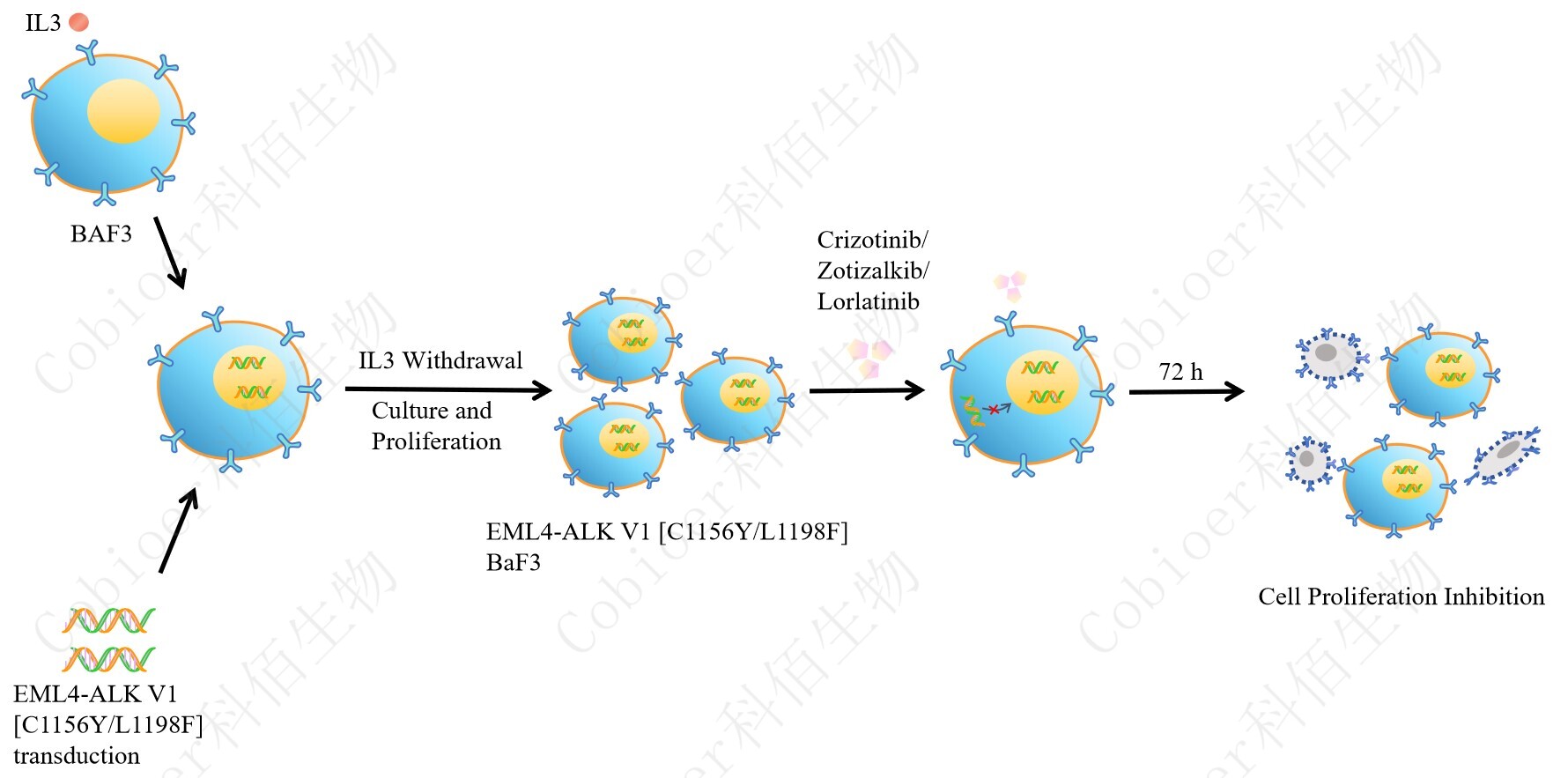 BaF3(小鼠原 B 細胞)的生長和增殖需要 IL-3 的維持。通過引入各種表達激酶的基因, 能作為 BaF3 的驅動基因,讓 BaF3 不再依賴 IL-3 而增殖,進而激酶基因成為 BaF3 增殖依 賴的驅動基因,用于評估小分子藥物對激酶的靶向抑制作用,原理及流程見下圖所示。