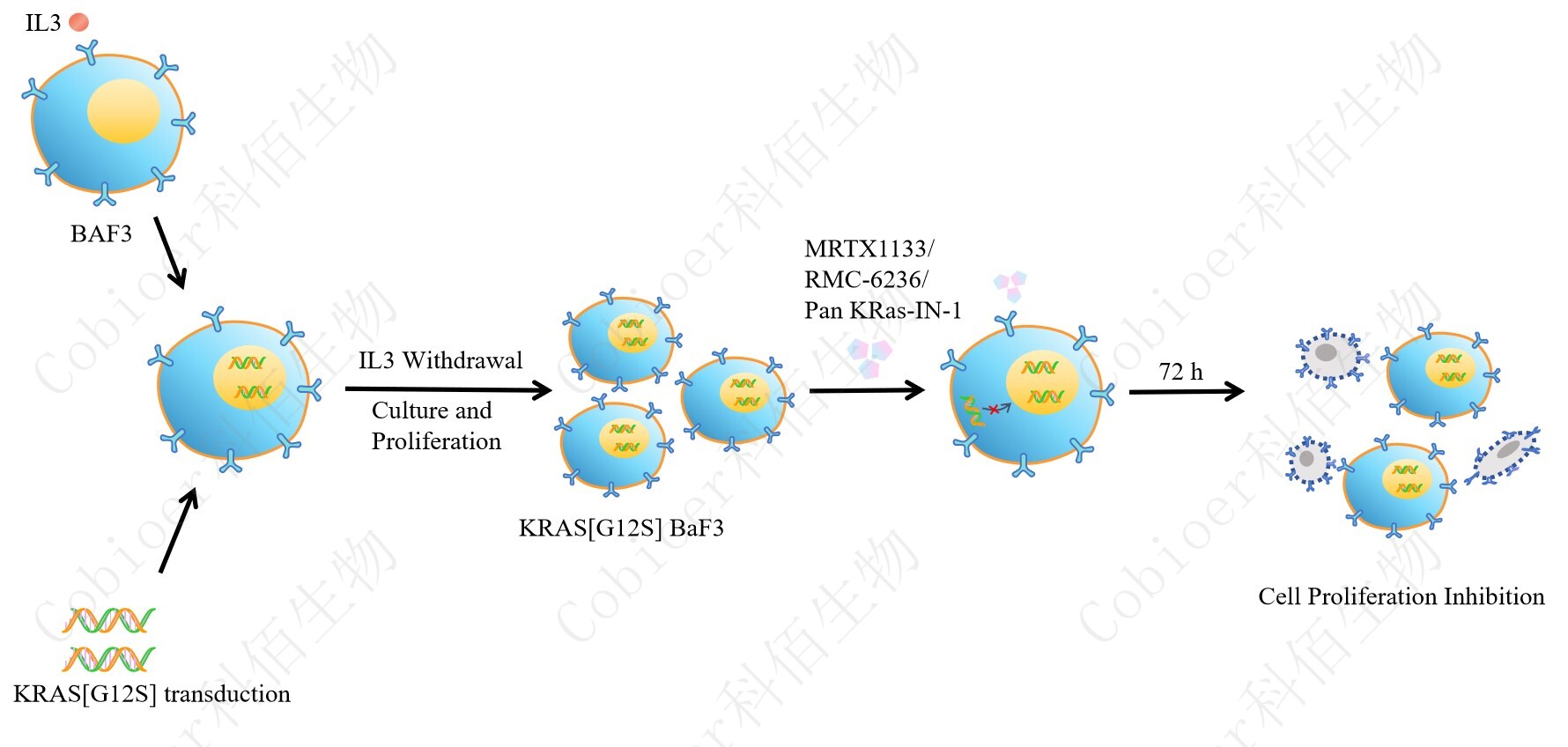 BaF3(小鼠原 B 細(xì)胞)的生長和增殖需要 IL-3 的維持。通過引入各種表達(dá)激酶的基因, 能作為 BaF3 的驅(qū)動(dòng)基因,讓 BaF3 不再依賴 IL-3 而增殖,進(jìn)而激酶基因成為 BaF3 增殖依 賴的驅(qū)動(dòng)基因,用于評(píng)估小分子藥物對(duì)激酶的靶向抑制作用,原理及流程見下圖所示。