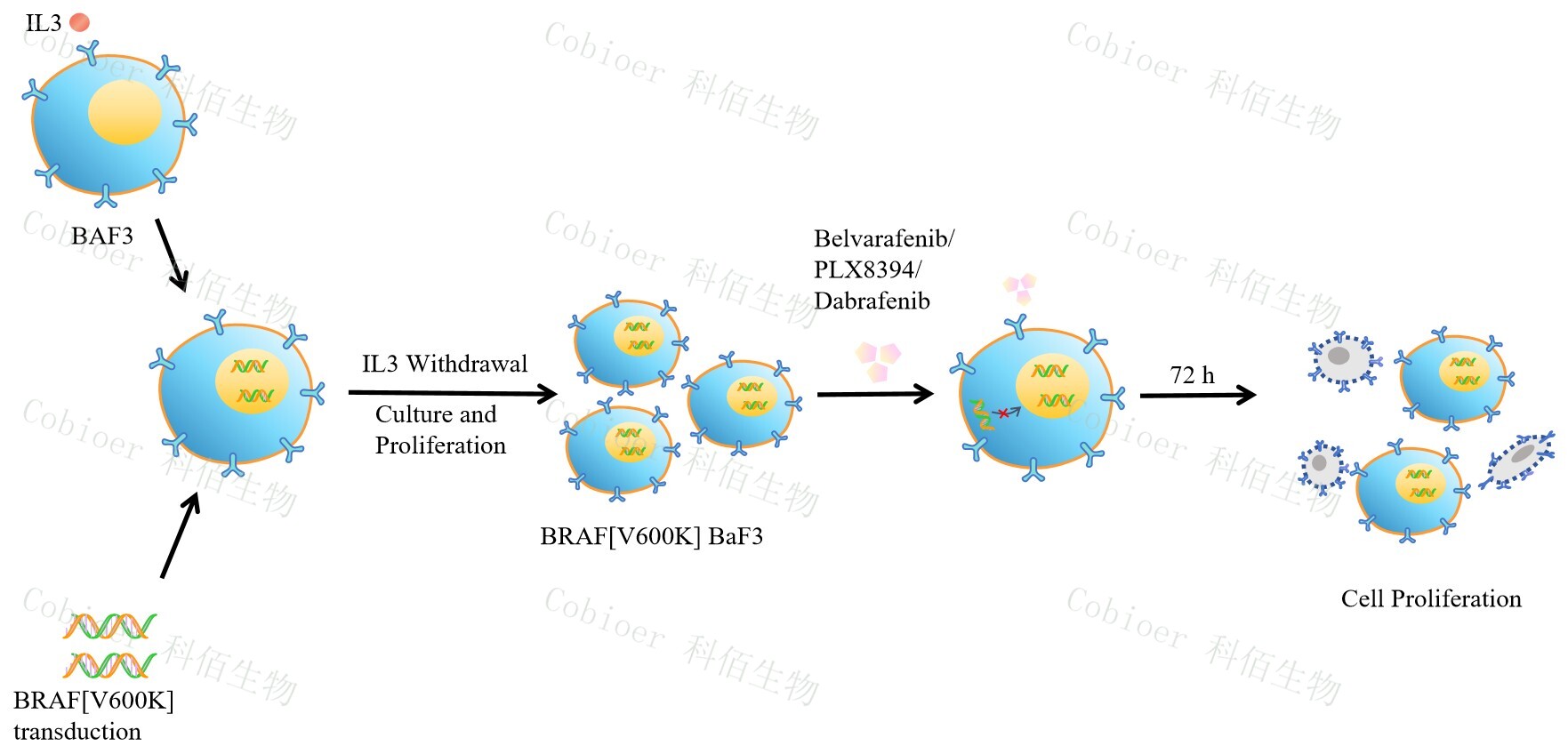BaF3(小鼠原 B 細(xì)胞)的生長和增殖需要 IL-3 的維持。通過引入各種表達(dá)激酶的基因, 能作為 BaF3 的驅(qū)動(dòng)基因,讓 BaF3 不再依賴 IL-3 而增殖,進(jìn)而激酶基因成為 BaF3 增殖依 賴的驅(qū)動(dòng)基因,用于評(píng)估小分子藥物對(duì)激酶的靶向抑制作用,原理及流程見下圖所示。 ![]() Figure 1. BRAF[V600K] BaF3 細(xì)胞的構(gòu)建原理圖 |