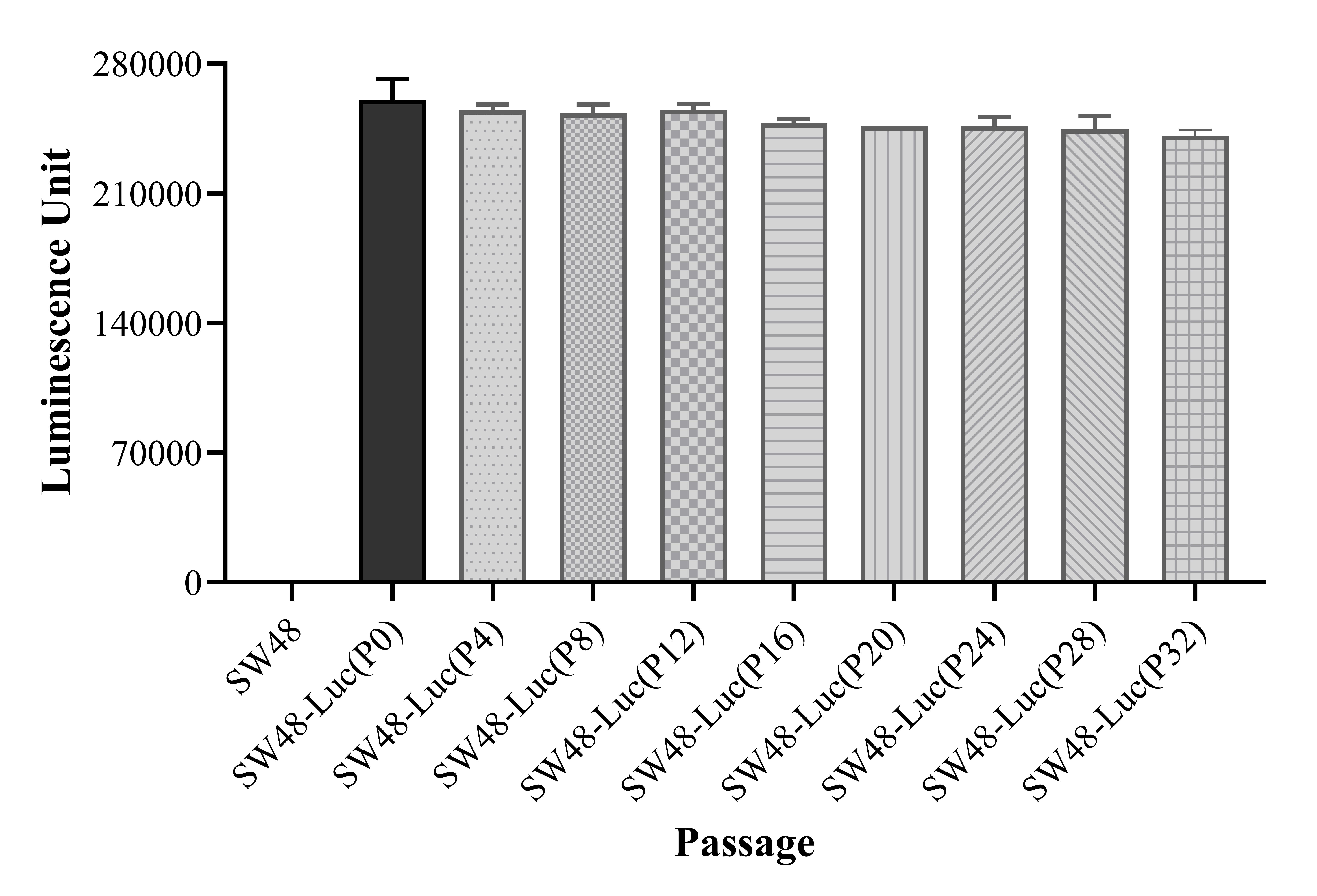 Figure 1. Stability test results. SW48-Luc showed at least 32 passage stability with similar luminescence unit. |