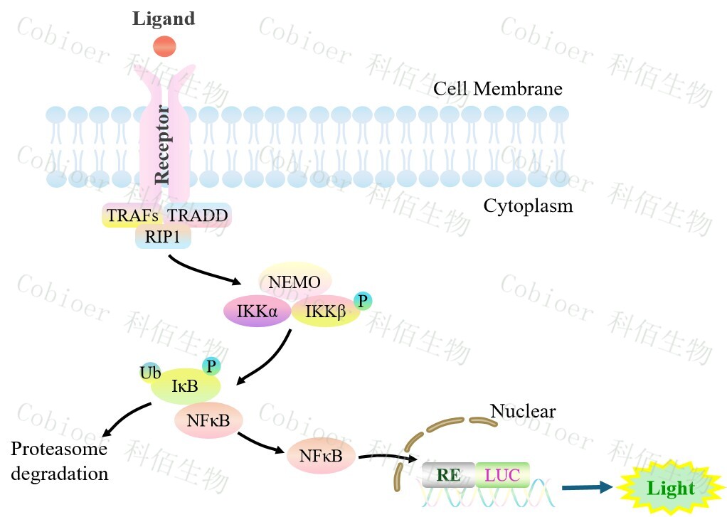 NFκB-Luc HEK293 報(bào)告基因細(xì)胞,是由 NFκB 調(diào)控并表達(dá) Luc 熒光素酶 報(bào)告基因的 HEK293 細(xì)胞。配體與受體結(jié)合后,激活 NF-κB 的原理見下圖所示。![]() Figure 1:NFκB-Luc HEK293 細(xì)胞模型原理圖 |
