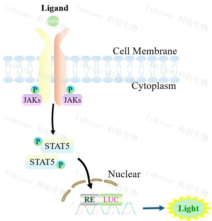 STAT5-Luc TF1 報(bào)告基因細(xì)胞,是由 STAT5 調(diào)控并表達(dá) Luc 熒光素酶報(bào) 告基因的 TF1 細(xì)胞。GM-CSF 與受體結(jié)合,激活 STAT5 的原理見(jiàn)下圖所示。![]() Figure 1. STAT5-Luc TF1 細(xì)胞模型原理圖 |