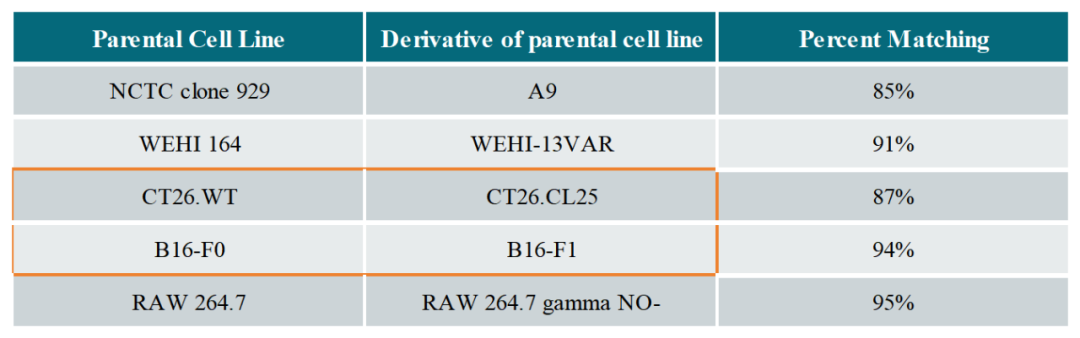1. B16-F0、B16-F1等衍生細(xì)胞系STR匹配度>90%,無法區(qū)分。