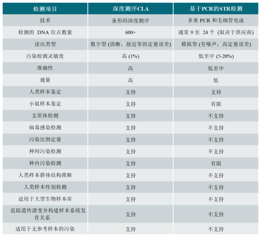 下表比較了用于細(xì)胞系認(rèn)證的深度測序CLA和基于PCR的STR檢測: