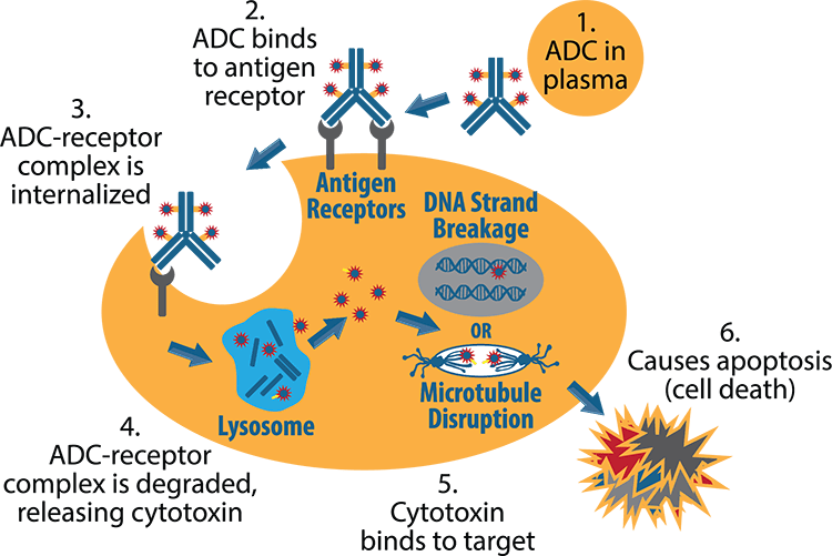 ADC藥物通過靜脈注射到血液中,隨著血液的流動,到達(dá)全身,但是科學(xué)家估計(jì)只有0.1%的ADC能到達(dá)患者的癌細(xì)胞。大部分會在循環(huán)系統(tǒng)和其他器官及組織中逐漸分解。到達(dá)癌細(xì)胞的ADC藥物一般是經(jīng)歷6個過程來起作用。