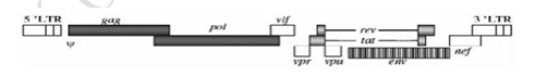 HIV-1為雙鏈RNA病毒,共有9個基因,如圖1所示。gag、pol、env3個基因編碼病毒的基本結(jié)構(gòu),tat、rev為調(diào)節(jié)基因,vif、vpr、vpu、nef 4個為輔助基因。其中,gag基因編碼病毒的核心蛋白,包括基質(zhì)蛋白、衣殼蛋白、核衣殼蛋白;pol基因編碼病毒復(fù)制所需的酶,如反轉(zhuǎn)錄酶、整合酶、蛋白酶,env基因編碼病毒的包膜糖蛋白,決定病毒感染宿主的靶向性。rev編碼的蛋白調(diào)節(jié)gag、pol、env的表達(dá)水平,tat編碼的蛋白參與RNA轉(zhuǎn)錄的控制。4個輔助基因編碼的蛋白則作為毒力因子參與宿主細(xì)胞的識別和感染。兩端為長末端重復(fù)序列(LTR),內(nèi)含復(fù)制所需的順式作用元件,如包裝信號元件Ψ。