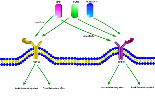 CRF1R和CRF2R主要是通過偶聯(lián)下游Gs蛋白參與體內(nèi)內(nèi)分泌系統(tǒng)、行為系統(tǒng)和免疫系統(tǒng)的壓力應(yīng)答。CRF1R和CRF2R在體內(nèi)被內(nèi)源性配體CRF和UCN1-3 激活。與UCN1對(duì)CRF1R和CRF2R都有高親和力不同,CRF對(duì)CRF1R的親和力明顯高于CRF2R,而UCN2和UCN3則表現(xiàn)出了對(duì)CRF2R選擇性激動(dòng)劑的活性。