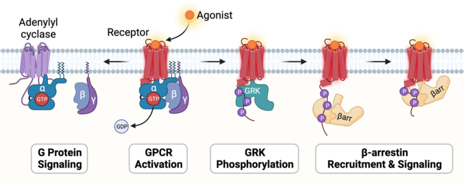 G蛋白偶聯(lián)受體(GPCR)是真核生物中最大,種類(lèi)最多的膜受體。目前,F(xiàn)DA 批準(zhǔn)上市的臨床藥物中,約三分之一的藥物作用于 GPCRs發(fā)揮治療作用,GPCRs 被認(rèn)為是新藥研發(fā)領(lǐng)域中最重要,也是最有應(yīng)用前景的藥物靶點(diǎn)之一。GPCR 可被多種配體激活,與配體結(jié)合后,GPCR 的構(gòu)象會(huì)發(fā)生變化,從而導(dǎo)致特定效應(yīng)蛋白的募集和激活,并觸發(fā)下游信號(hào)通路的調(diào)節(jié)。GPCR的下游信號(hào)主要由G蛋白和β-arrestin介導(dǎo)。兩種信號(hào)之間的平衡可以受到偏向性配體的調(diào)控。偏向性配體選擇性激活某些信號(hào),同時(shí)減少或阻止其它信號(hào),為開(kāi)發(fā)副作用小的藥物提供了方向。