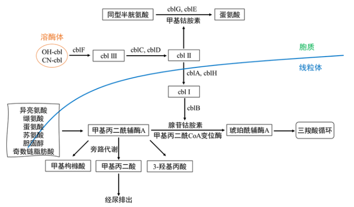 甲基丙二酸是異亮氨酸、纈氨酸、甲硫氨酸、蘇氨酸、膽固醇和奇數(shù)鏈脂肪酸分解代謝途徑中甲基丙二酰輔酶A的代謝產(chǎn)物,正常情況下,在甲基丙二酰輔酶A變位酶及腺苷鈷胺素的作用下轉(zhuǎn)化成琥珀酰輔酶A,參與三羧酸循環(huán)。具體發(fā)病機(jī)制見下圖: