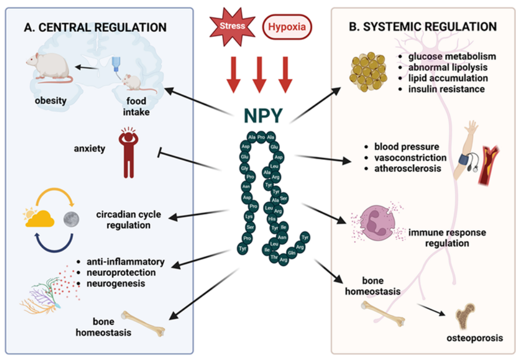 NPY受體被一個(gè)結(jié)構(gòu)相關(guān)的富含酪氨酸的多肽家族激活,即NPY(神經(jīng)肽Y),PYY(肽酪氨酸-酪氨酸)和PP(胰腺多肽),它們具有36個(gè)氨基酸的共同長(zhǎng)度和一個(gè)修飾的C段。NPY是中樞和周圍神經(jīng)系統(tǒng)中最豐富的肽之一,在能量穩(wěn)態(tài)中起著重要作用。NPY參與應(yīng)激反應(yīng)、食欲刺激、晝夜節(jié)律、免疫和骨骼穩(wěn)態(tài)等過程的中樞調(diào)節(jié)。在外周,NPY與去甲腎上腺素共同從交感神經(jīng)元釋放,影響代謝、心血管系統(tǒng)、骨骼健康和免疫反應(yīng)。盡管NPY的表達(dá)和釋放在很大程度上與交感神經(jīng)系統(tǒng)活性相關(guān),但現(xiàn)在已知幾種細(xì)胞對(duì)NPY有反應(yīng),NPY系統(tǒng)的失調(diào)與幾種病理狀況有關(guān),包括肥胖、心血管疾病、糖尿病和胰島素抵抗,這些狀況也經(jīng)常伴有蛋白尿和CKD。