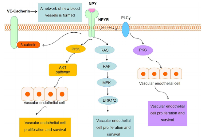 以血管內(nèi)皮細(xì)胞為例,NPY與其受體結(jié)合后,通過PI3K/AKT通路、RAS/RAF/MEK/ERK1/2通路、PKC通路促進(jìn)內(nèi)皮細(xì)胞增殖,為血管提供營(yíng)養(yǎng),調(diào)節(jié)微環(huán)境。