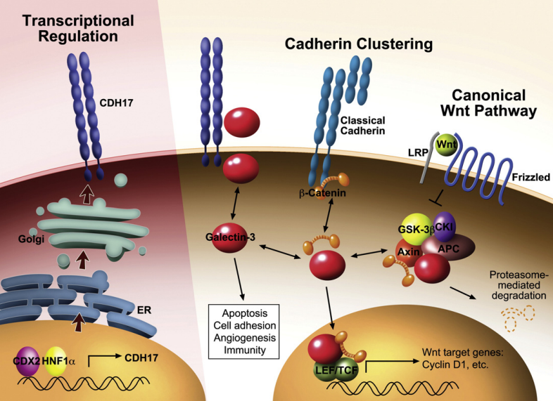 雖然CDH17在癌癥中作用的確切機制仍然難以捉摸,但幾項研究已經(jīng)揭示了它的潛在功能。在肝細胞癌(HCC)中,CDH17能與E-cadherin結合調控細胞的黏附,以及CDH17胞內銜接蛋白Galectin-3通過在細胞核中與β-catenin結合參與典型Wnt信號傳導,這表明CDH17參與Wnt信號的激活。