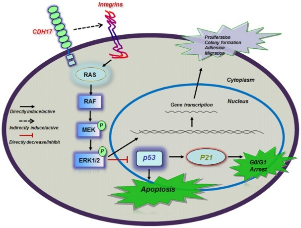 另有研究結果表明,CDH17間接影響整合素以穩(wěn)定其結構和活性。在人胃癌細胞MGC-803,CDH17過表達能夠激活Ras/Raf/MEK/ERK信號通路,促進細胞在體內的致瘤性。