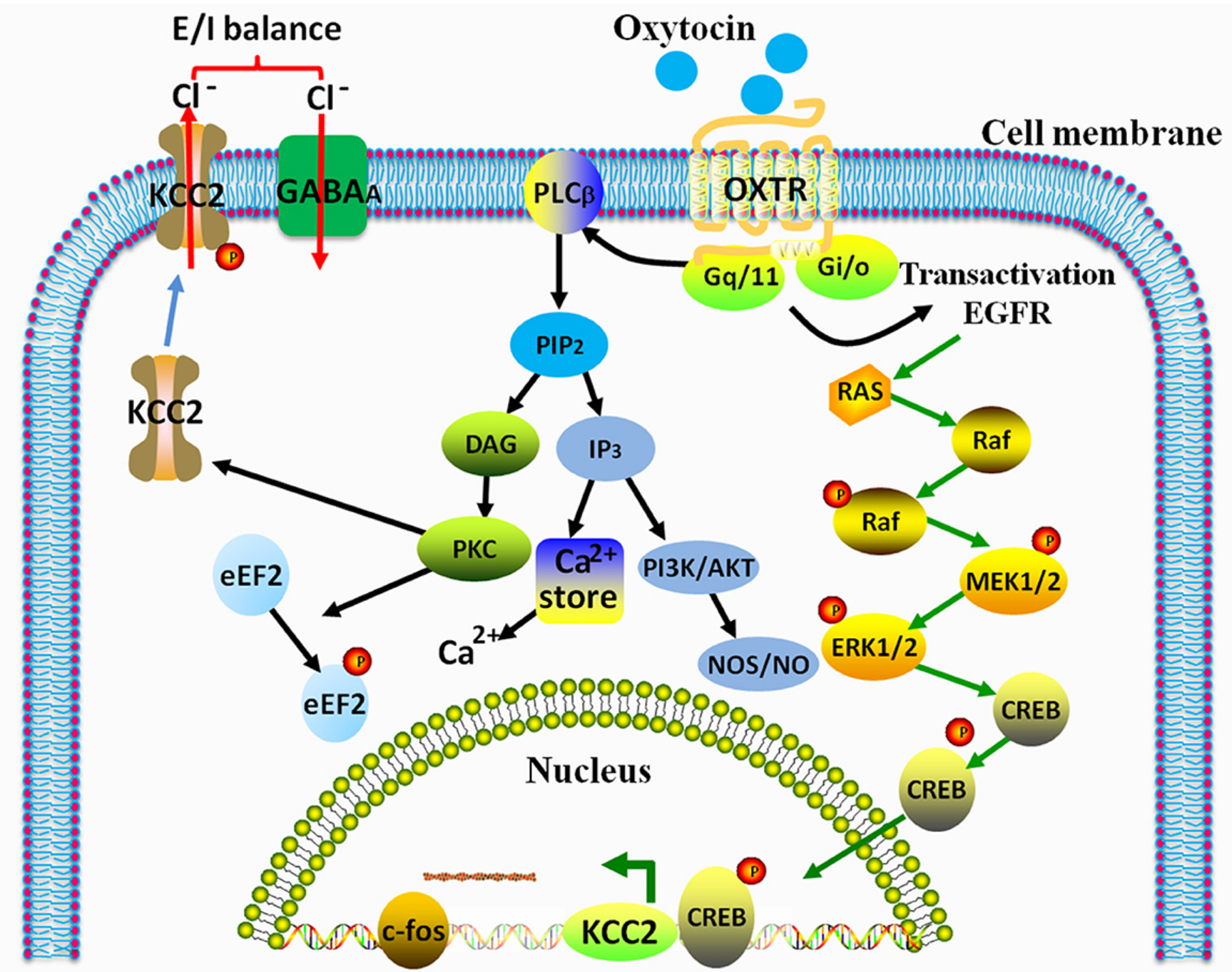 催產(chǎn)素(OXT)是大腦中由下丘腦室旁核(PVN)和視上核(SON)產(chǎn)生的神經(jīng)肽,主要作為外周系統(tǒng)中的激素,可促進(jìn)母乳喂養(yǎng)時的乳汁分泌,調(diào)節(jié)分娩時的子宮收縮,緩解疼痛和促進(jìn)分娩過程,促進(jìn)傷口愈合。此外,中樞神經(jīng)系統(tǒng)(CNS)中的 OXT 系統(tǒng)在社會認(rèn)可、社交行為、焦慮相關(guān)行為和自主神經(jīng)功能中起著重要作用,例如母體行為、攻擊性、交配、依戀和性行為。除了促社會效應(yīng)外,OXT 還被確定為大腦中重要的抗應(yīng)激和抗焦慮因子,通過其靶受體(催產(chǎn)素受體,OXTR)激活細(xì)胞內(nèi) MEK/ERK 信號傳導(dǎo)。