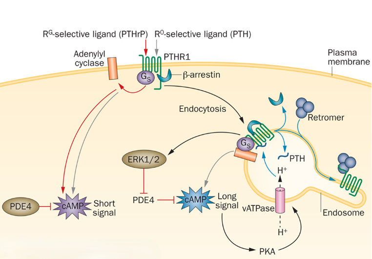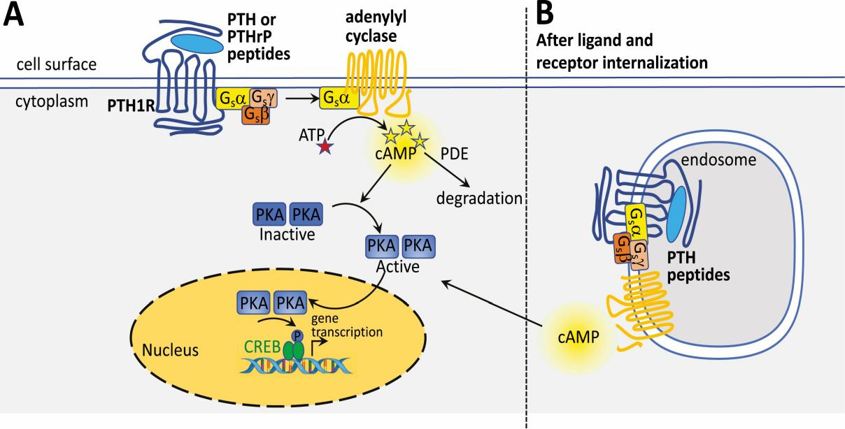 PTH1R的核心結(jié)構(gòu)包括N端胞外結(jié)構(gòu)域(ECD)、7次跨膜結(jié)構(gòu)域(7TMD,由七個跨膜α螺旋和連接環(huán)組成)和C端胞內(nèi)結(jié)構(gòu)域。PTH 或 PTHrP 的氨基末端肽與PTH1R的ECD結(jié)合后,會導(dǎo)致 G 蛋白的激活,主要是 Gα,它激活腺苷酸環(huán)化酶,并以磷酸二酯酶限制的方式催化 cAMP 的產(chǎn)生。當(dāng)達到足夠的局部細(xì)胞內(nèi)濃度時,cAMP 激活 PKA,PKA 易位到細(xì)胞核,在核內(nèi)磷酸化 CREB,從而能夠在特定基因上轉(zhuǎn)錄 cAMP 響應(yīng)元件,從而調(diào)控成骨細(xì)胞分化和鈣磷代謝。PTH1R 信號傳導(dǎo)可以發(fā)生在細(xì)胞表面,或者對于 PTH 氨基末端肽,它也可以發(fā)生在配體和受體內(nèi)化后。