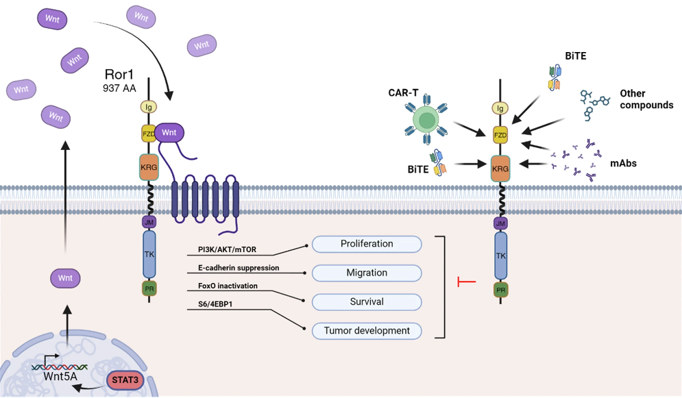 圖1:ROR1信號(hào)傳導(dǎo)和靶向療法