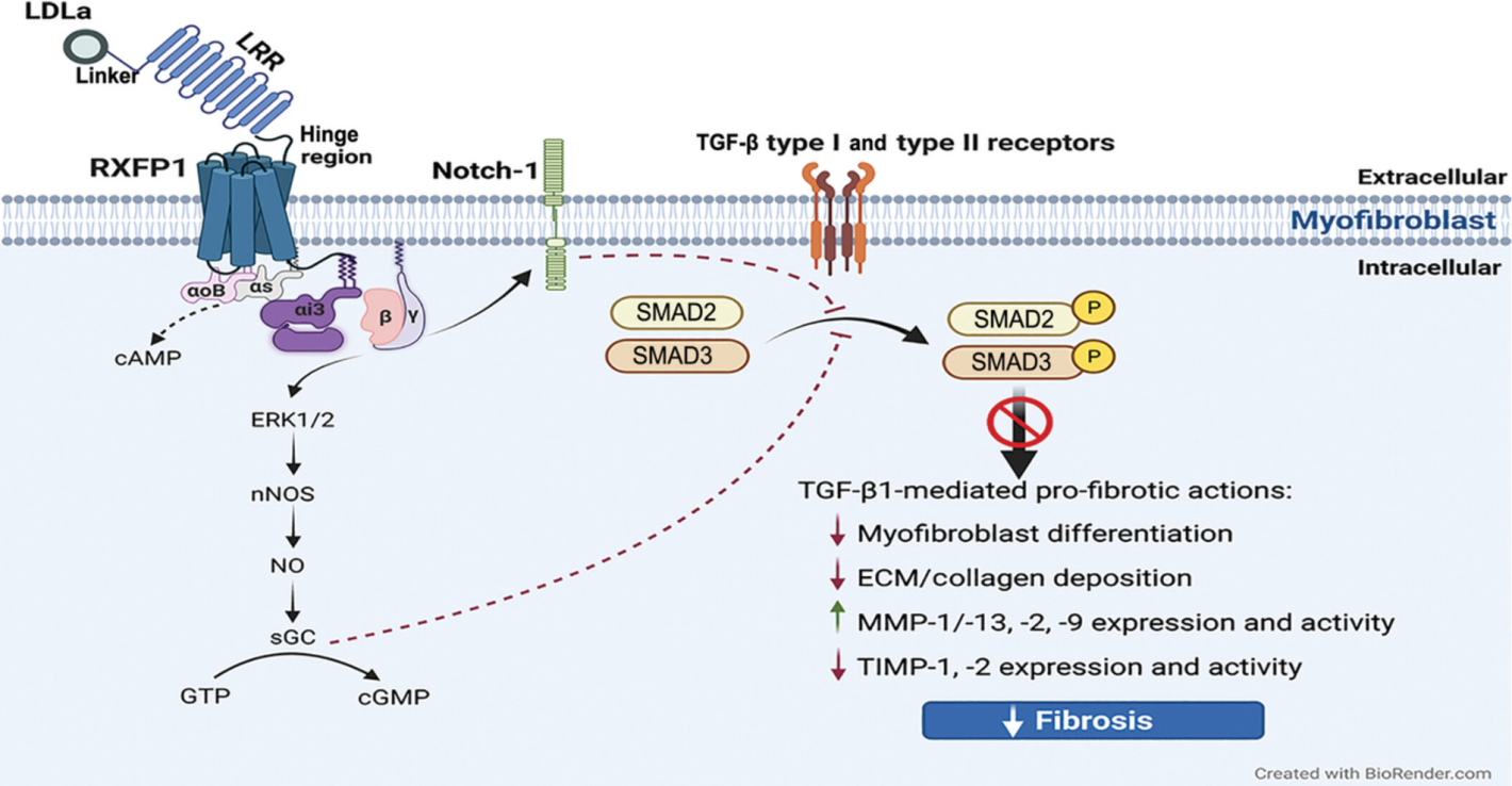 RXFP1 是一種 C 型 LGR 相關 GPCR,含有由多個細胞外基序組成的約 400 個氨基酸的大細胞外區(qū)域,包括富含亮氨酸的重復結(jié)構(gòu)域(LRR)和低密度脂蛋白 A 類 (LDLa) 模塊,它們通過連接子區(qū)域連接。RXFP1在其 LRR 相關胞外結(jié)構(gòu)域內(nèi)激活,引發(fā)受體的構(gòu)象變化,然后允許其 7TM 結(jié)構(gòu)域的細胞外環(huán)內(nèi)低親和力結(jié)合位點的相互作用和激活,這由其連接子區(qū)域促進。受體的連接子區(qū)域在配體結(jié)合時穩(wěn)定受體構(gòu)象方面起著關鍵作用,并將殘基定位在連接子區(qū)域和 LDLa 模塊內(nèi)以與 7TM 結(jié)構(gòu)域結(jié)合并激活受體。然后,該作用使 LDLa 模塊能夠充當系留激動劑,并在配體結(jié)合時引導受體信號傳導。位于 RXFP1 C 末端的鉸鏈區(qū)域在受體激活時也會發(fā)生構(gòu)象和增加暴露,以誘導 G 蛋白 (Gαs, GαOB, Gαi3和 Gβγ) 活動。在肌成纖維細胞中,這導致 cAMP 短暫升高,但 pERK1/2 增加更持久,nNOS-NO-sGC-cGMP 活性因 RXFP1-ERK1/2 依賴性增加。RXFP1-pERK1/2-nNOS-NO-sGC-cGMP 依賴性途徑的激活或肌成纖維細胞直接激活 cGMP 然后抑制 SMAD2 和 SMAD3 水平的 TGF-β1 信號轉(zhuǎn)導,從而抑制 TGF-β1 促進肌成纖維細胞分化和肌成纖維細胞誘導的 ECM/膠原蛋白合成和沉積的能力。RXFP1 激活還可以調(diào)節(jié) Notch-1 依賴性信號傳導,以抑制肌成纖維細胞中的 TGF-β1/SMAD3 軸。此外,RXFP1-pERK1/2-nNOS-NO-sGC-cGMP依賴性途徑的激活導致ECM降解MMP的表達和活性增加(當TGF-β1活性上調(diào)時通常受到抑制),以及TIMP的活性降低,這將促進MMP誘導的已建立ECM/膠原沉積的分解,并有助于減少纖維化進展。