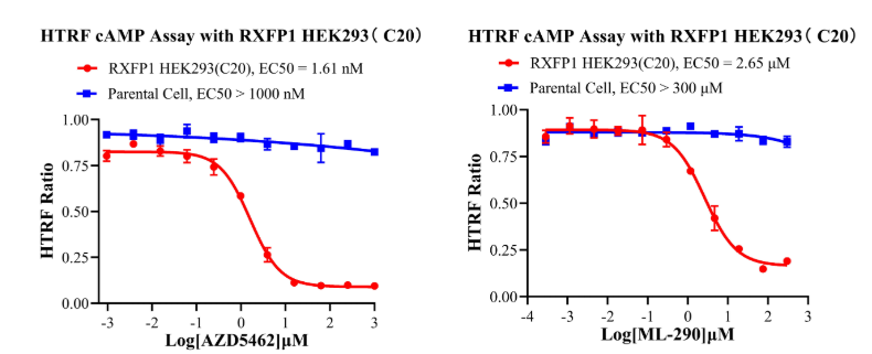 為助力RXFP1靶點藥物研發(fā),南京科佰開發(fā)了RXFP1 CHO、RXFP1 HEK293細胞篩選模型,產(chǎn)品驗證結(jié)果如下: