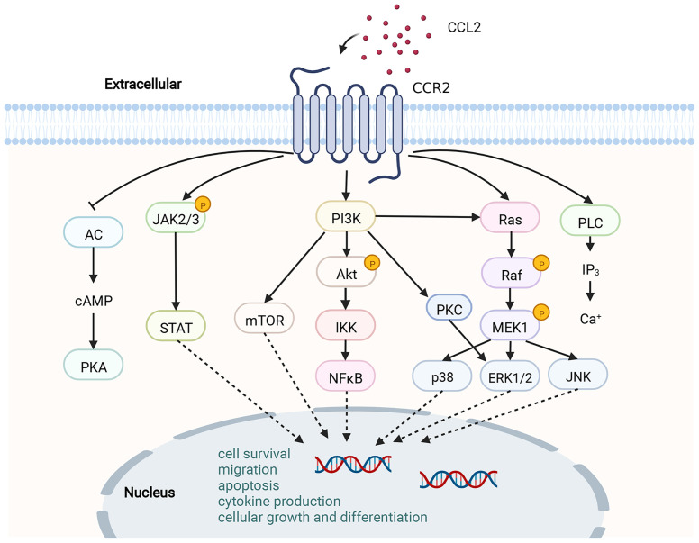 通過結(jié)合CCL2,CCR2經(jīng)歷二聚化和內(nèi)化,誘導單核細胞趨化蛋白-1誘導蛋白-1(MCPIP1)的表達。隨后,MCP1P1開始轉(zhuǎn)錄和表達IL-1、CCL2和TNF基因。當CCL2觸發(fā)CCR2時,會啟動多種細胞內(nèi)G蛋白介導的信號通道,例如JAK/STAT、PI3K/MAPKs和PI3K/Akt/ERK/NF-κB。這些信號通路的激活會激活多種轉(zhuǎn)錄因子和基因,這些因子參與細胞因子產(chǎn)生、細胞生長與分化、細胞存活、遷移與凋亡、血管生成及炎癥。CCL2-CCR2軸與多種疾病的進展相關(guān),如動脈粥樣硬化、急性肝衰竭、類風濕性關(guān)節(jié)炎、肺動脈高壓、糖尿病及并發(fā)癥以及癌癥。因此,CCL2-CCR2軸被認為是此類疾病管理的潛在靶點。