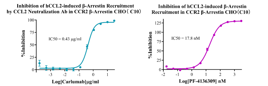 為助力CCR2靶點藥物研發(fā),南京科佰開發(fā)了CCR2/β-Arrestin/CHO、CCR2/CHO、CCR2/Gα15/CHO、CCR2/Gα16/HEK293細胞篩選模型,產(chǎn)品驗證結(jié)果如下: