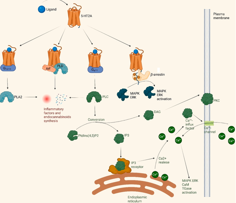 5-HT2A受體廣泛分布于中樞神經(jīng)系統(tǒng)(CNS)和外周組織中。在中樞神經(jīng)系統(tǒng)內(nèi),它主要位于富含血清素的區(qū)域,包括新皮層、嗅結(jié)節(jié)、海馬和杏仁核,以及邊緣和基底神經(jīng)節(jié)結(jié)構(gòu)7。5-HT2A受體在調(diào)節(jié)認(rèn)知、情緒和神經(jīng)可塑性過(guò)程中起著關(guān)鍵作用。它在大腦皮層V層錐體神經(jīng)元的頂端樹(shù)突上的濃度特別高,能夠通過(guò)谷氨酸釋放調(diào)節(jié)和與其他受體系統(tǒng)的相互作用來(lái)調(diào)節(jié)工作記憶、注意力和其他執(zhí)行功能。這種受體對(duì)海馬和杏仁核功能至關(guān)重要,海馬和杏仁核是參與學(xué)習(xí)、記憶形成和情緒處理的關(guān)鍵結(jié)構(gòu)。這兩個(gè)區(qū)域都從中縫核接收密集的5-羥色胺能神經(jīng)支配,5-HT2A受體激活通過(guò)增強(qiáng)空間編碼精度、調(diào)節(jié)GABA等中間神經(jīng)元介導(dǎo)的抑制、促進(jìn)記憶鞏固過(guò)程等過(guò)程調(diào)節(jié)其活性。影響這些過(guò)程與神經(jīng)系統(tǒng)疾病的治療有關(guān)。盡管5-HT2A受體拮抗劑(如氯氮平、哌替嗪)和反向或部分激動(dòng)劑被廣泛用于治療精神分裂癥、認(rèn)知障礙和偏頭痛,但在治療上使用其激動(dòng)劑具有挑戰(zhàn)性。這種困難是因?yàn)槭荏w可以激活不同的效應(yīng)蛋白,特別是Gq和β-arrestin。Gq主要與受體結(jié)合,啟動(dòng)磷脂酶C(PLCβ)的激活,然后導(dǎo)致肌醇三磷酸(IP3)和二?;视停―AG)等次級(jí)信使的產(chǎn)生,導(dǎo)致鈣釋放和蛋白激酶C(PKC)激活12。此外,5-HT2A受體與β-arrestin相互作用,促進(jìn)受體內(nèi)化和脫敏,同時(shí)也啟動(dòng)不同的細(xì)胞內(nèi)信號(hào)級(jí)聯(lián)。這些機(jī)制導(dǎo)致不同的生理效應(yīng),如抗抑郁藥和致幻結(jié)果。