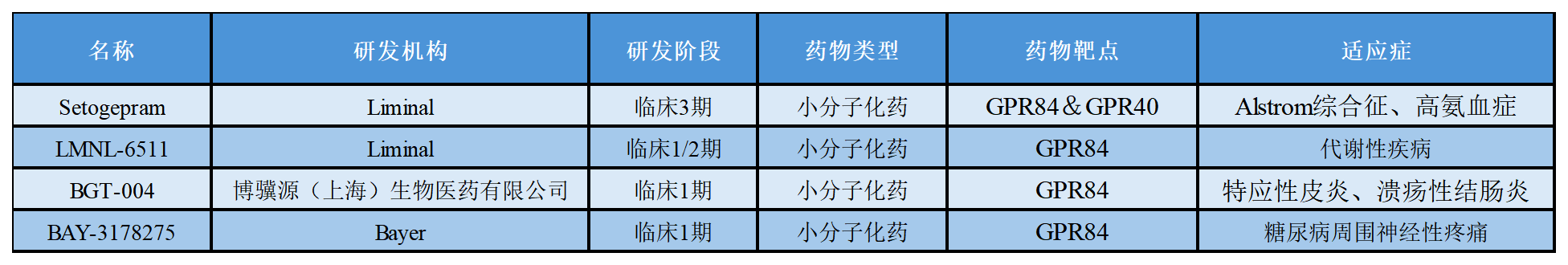 關(guān)于GPR84在研的部分藥物進(jìn)展如下表所示:
