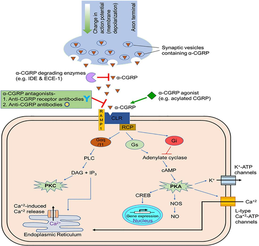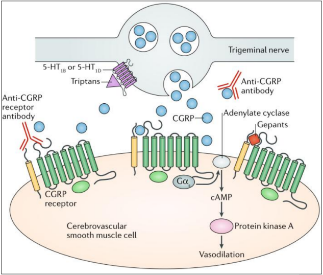 降鈣素基因相關(guān)肽(calcitonin gene-related peptid,CGRP)是一個含有37個氨基酸殘基的感覺神經(jīng)源性多肽,分為α-CGRP和β-CGRP兩個亞型,廣泛分布于中樞神經(jīng)系統(tǒng)(主要是三叉神經(jīng)血管系統(tǒng)、丘腦和小腦)。CGRP是一種強效的血管擴(kuò)張劑,它主要由感覺神經(jīng)(如三叉神經(jīng))釋放。CGRP釋放后與腦血管平滑肌細(xì)胞表面的CGRP受體結(jié)合,引起腦血管擴(kuò)張。CGRP受體的結(jié)構(gòu)主要包括:降鈣素受體樣受體(CALCRL)、活性修飾蛋白受體(RAMP)及結(jié)構(gòu)蛋白受體(RCP)。CGRP受體復(fù)合物是一種G蛋白偶聯(lián)受體,通過激活蛋白激酶A系統(tǒng),參與疼痛信息的病理調(diào)控過程。