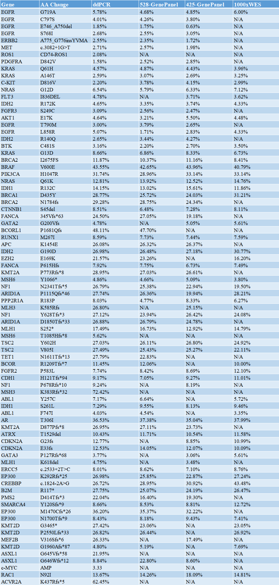 3.定標(biāo)方案更科學(xué):采取4種方法定標(biāo),分別是1000xWES,3000x 425 Gene-Panel(友商-組織樣本),3000x 528 Gene-Panel(內(nèi)部開發(fā)探針捕獲法),82位點的ddPCR(3復(fù)孔);