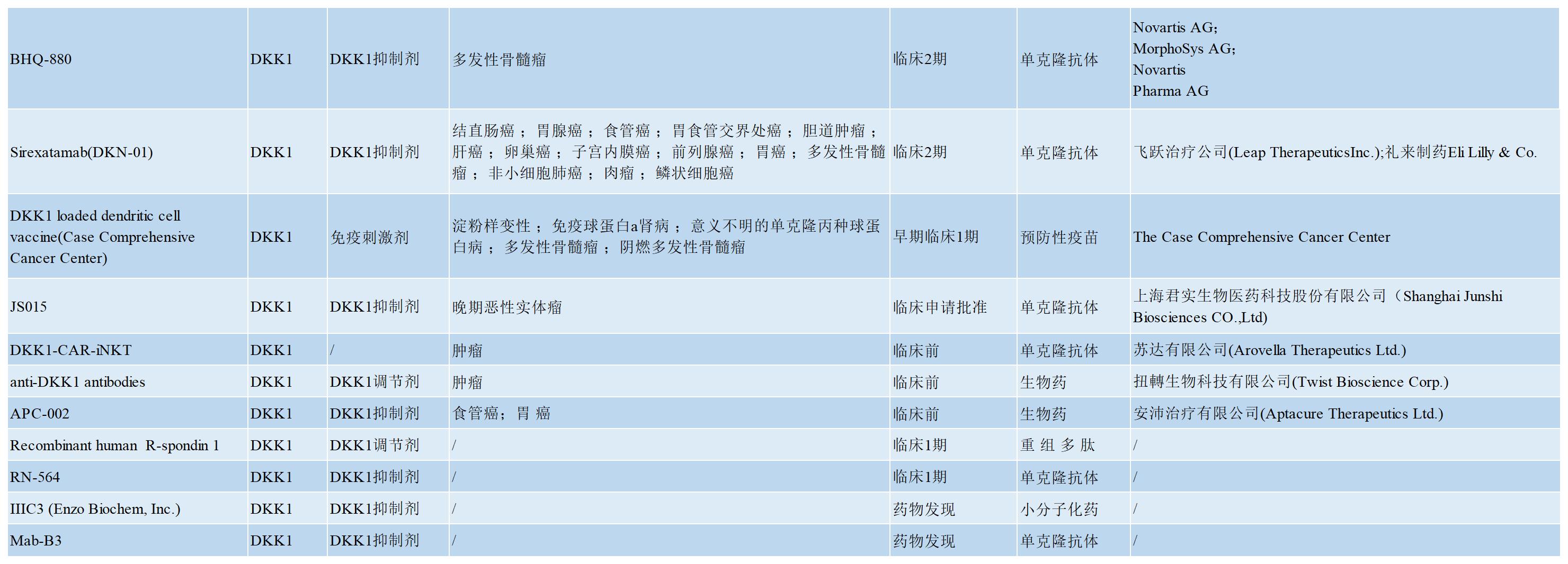 DKK1具有調(diào)節(jié)免疫的特性,它對(duì)免疫系統(tǒng)的抑制作用使其成為免疫治療的一個(gè)有前景的靶點(diǎn)。此前,Leap Therapeutics開(kāi)發(fā)了抗DKK1中和抗體DKN-01并在晚期胃食管交界處和胃癌癥(GEJ/GC)以及婦科癌癥的I期或II期試驗(yàn)中進(jìn)行了評(píng)估,其方案包括與紫杉醇或pembrolizumab的單藥治療和聯(lián)合治療比較,值得注意的是,患有Wnt信號(hào)突變的婦科癌癥患者可以從DKN-01治療中獲益。GEJ/GC的另一項(xiàng)正在進(jìn)行的臨床研究也表明,在腫瘤表達(dá)高水平DKK1(DKK1高)的患者中生存率和客觀(guān)反應(yīng)結(jié)果都有所提高;非常令人鼓舞的結(jié)果表明,DKN-01加Keytruda治療可使中位無(wú)進(jìn)展生存期(PFS)超過(guò)22周,中位總生存期(OS)接近32周,在既往未接受抗PD-1/PD-L1治療的DKK1高GEJ/GC患者中,ORR為50%,疾病控制率(DCR)為80%;在對(duì)PD-1/PD-L1治療難治的6名GEJ/GC患者中,3名血清DKK1水平高的患者病情穩(wěn)定,而3名血清DKK1水平低的患者病情則發(fā)生進(jìn)展。這些結(jié)果表明,DKK1抑制治療顯著改善了血清DKK1水平高的患者的療效,并由此得出在DKK1高表達(dá)腫瘤患者中使用DKK1抑制劑和PD1/PDL-1免疫檢查點(diǎn)聯(lián)合治療的方案是一種獲得更好療效的策略。目前已有多個(gè)DKK1抑制劑處于研發(fā)階段,其中多數(shù)為DKK1的中和抗體,也有少量的小分子及重組多肽,小核酸藥物等( 如下表所示)。