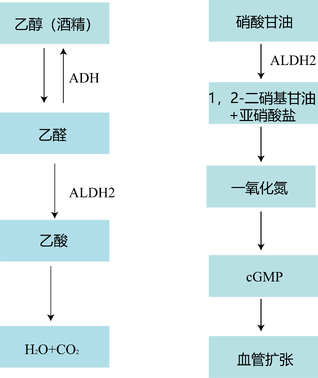 ALDH2(acetaldehyde dehydrogenase 2),線粒體乙醛脫氫酶2,位于第12號染色體的12q24.2位置,全長43,438bp,共有15個外顯子,編碼由517個氨基酸殘基組成的蛋白質。ALDH2是人體催化硝酸甘油生物轉化的主要途徑,該酶同時具有脫氫酶和酯酶的催化活性,其酯酶活性可以通過將硝酸甘油脫硝產生NO,進而引起血管擴張。