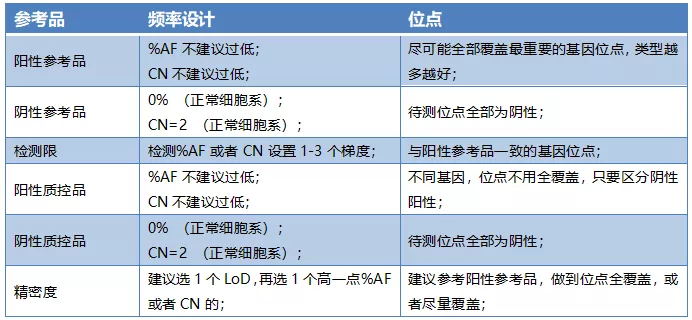 2.陽性參考品設(shè)置最為復雜,著重聚焦臨床意義的基因位點,不要求全覆蓋,同時要考慮靈敏度(最低檢出限LoD)設(shè)置,考慮到濃度梯度或突變梯度的不同,應對各水平陽性參考品設(shè)置相應檢出要求;