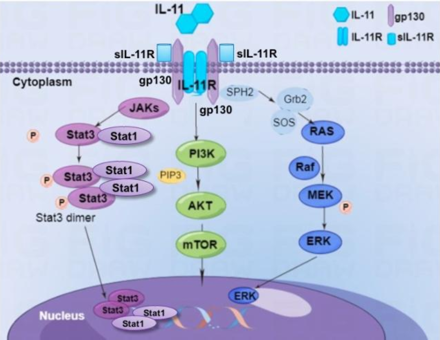 IL-11主要通過JAK/STAT3、Ras/Raf/MAPK和磷脂酰肌醇3激酶(PI3K/Akt)三條下游信號(hào)通路調(diào)控細(xì)胞功能。