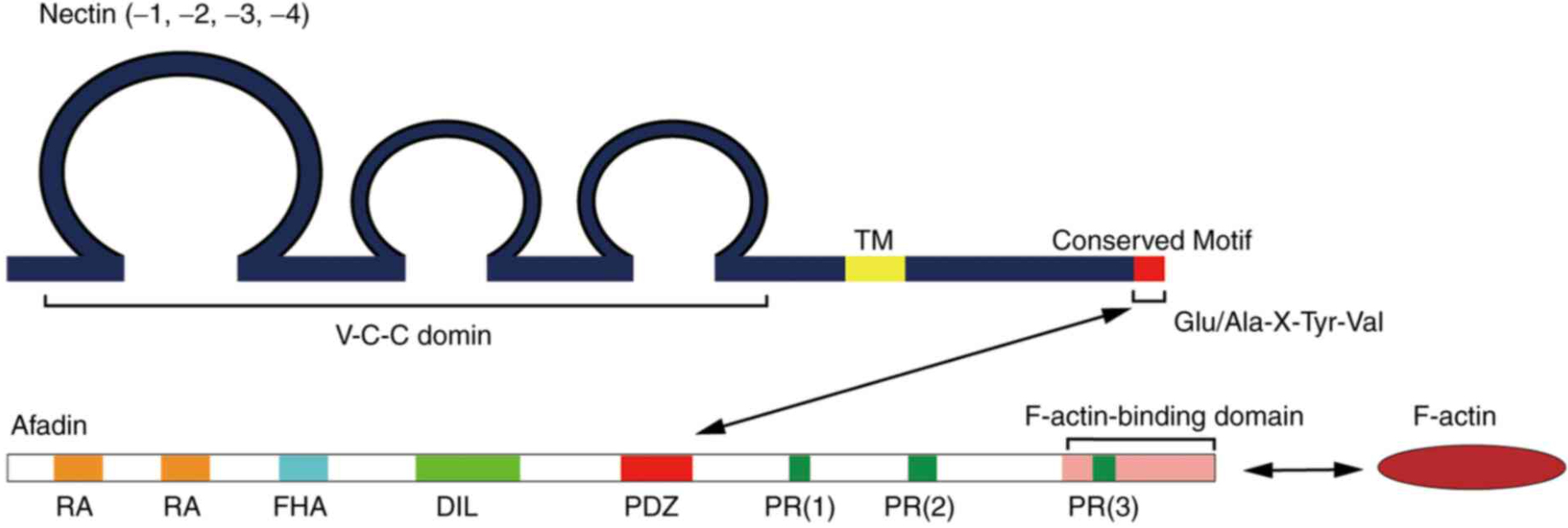 胞質(zhì)尾的C端都包含一個(gè)afadin (一種 F-肌動(dòng)蛋白結(jié)合蛋白)結(jié)合基序,與Nectin-4不同的是,Nectin-1、Nectin-2、Nectin-3的afadin結(jié)合基序都是保守序列 Glu/Ala-X-Tyr-Val,可與 afadin的PDZ 結(jié)構(gòu)域結(jié)合;而Nectin-4可通過其C末端的 Gly-His-Leu-Val 基序與銜接分子afadin結(jié)合。當(dāng)Nectins與銜接分子afadin結(jié)合后,afadin會(huì)結(jié)合并募集絲狀肌動(dòng)蛋白組件 (F-actin),從而促進(jìn)細(xì)胞與細(xì)胞之間的粘附。Nectin家族與鈣黏著蛋白共同作用,對粘著連接和緊密連接的產(chǎn)生和維持具有顯著影響,它們調(diào)節(jié)多種細(xì)胞行為,包括細(xì)胞粘附、生長、分化、遷移和凋亡。