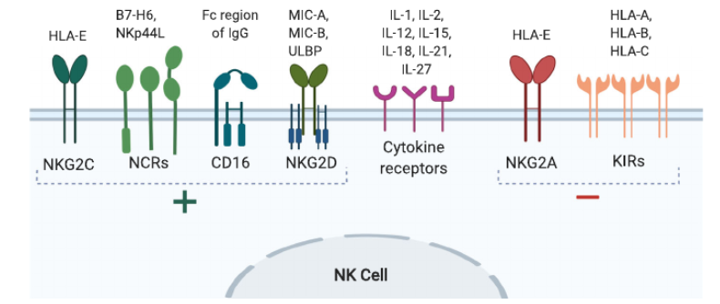 NKG2A/CD94受體與肽呈遞HLA-E結合可導致NKG2A中ITIMs的磷酸化。磷酸化的ITIMs負責募集和激活細胞內磷酸酶SHP-1和SHP-2,從而抑制激活T細胞受體(TCR)和NKG2D等受體產生的激活信號。經典的HLA分子通常會丟失,與之相反,HLA- E在腫瘤細胞中的表達通常會升高。NKG2A和HLA-E之間的相互作用有助于腫瘤免疫逃逸,NKG2A介導的機制目前被用來開發(fā)潛在的抗腫瘤治療策略。此外,破壞NKG2A與其配體的相互作用被證明可有效增強抗腫瘤免疫應答。