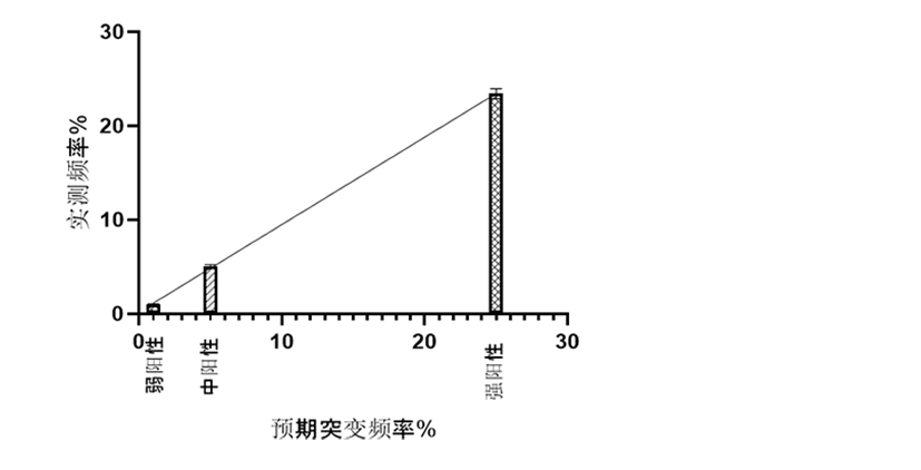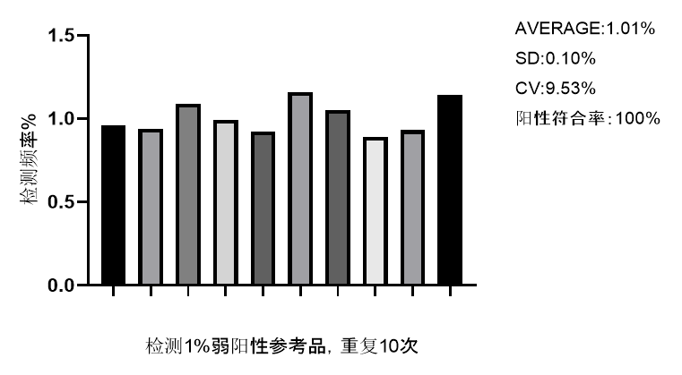 Figure 2. 同一批號試劑盒對一份弱陽性參考品進(jìn)行10次重復(fù)檢測,結(jié)果均為T790M陽性,陽性符合率100%,突變頻率變異系數(shù)CV≤30%,符合預(yù)期。