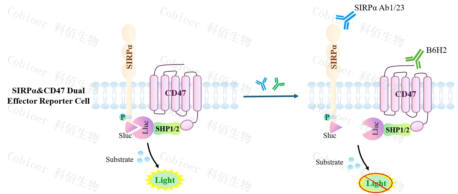 SIRPα&CD47 Dual Effector Reporter Cell 報告基因藥靶模型很好的模擬了體內(nèi) SIRPα的 信號轉(zhuǎn)導(dǎo)過程,原理見下圖所示。