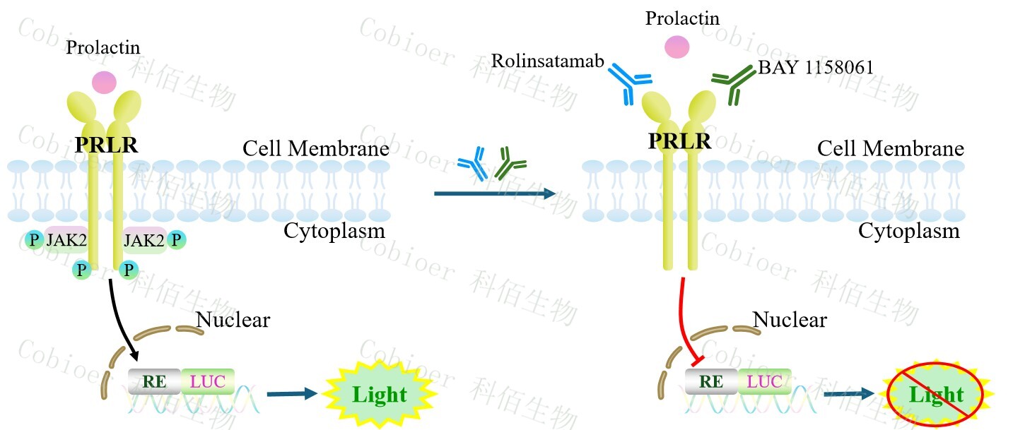 PRL Effector Reporter Cell 報(bào)告基因藥靶模型很好的模擬了體內(nèi) PRL 的信號(hào)轉(zhuǎn)導(dǎo)過程, 原理見下圖所示。![]() Figure 1. PRL Effector Reporter Cell 模型原理圖 |
